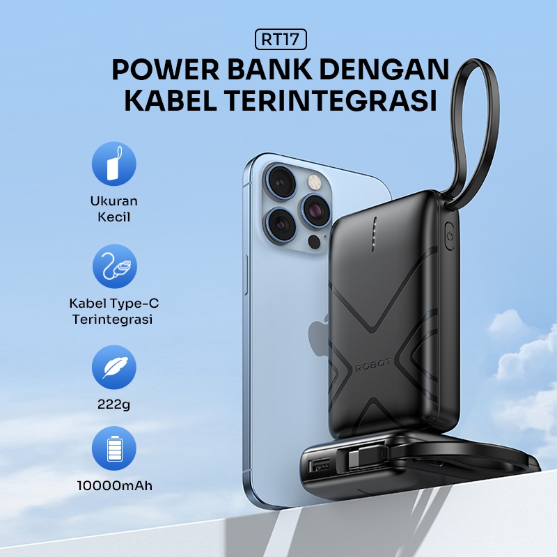 ROBOT Smart Powerbank Mini 37Wh 10000mAh With Cable USB to Type C Power Bank Fast Charging RT17 Original - Garansi 1 Tah