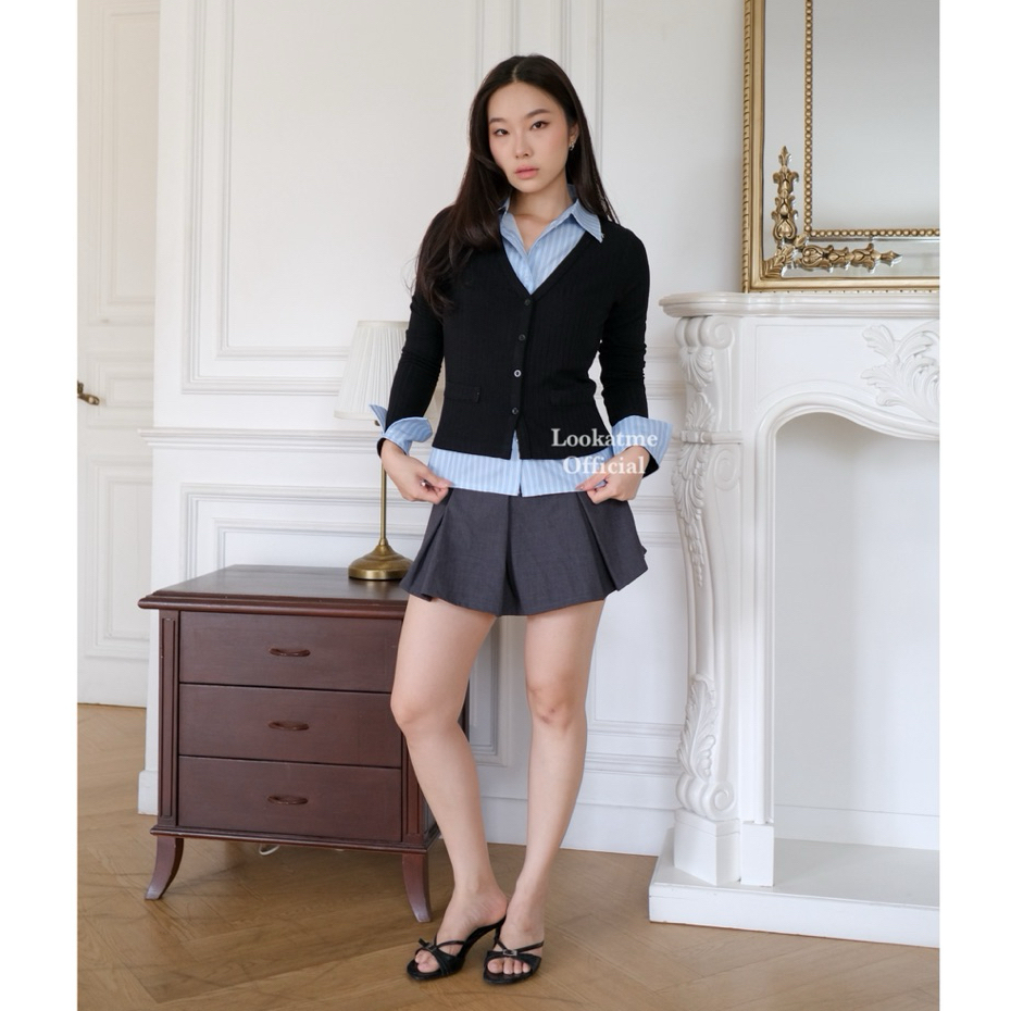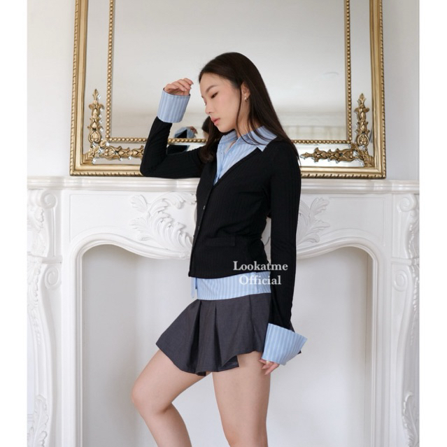 ODETTE T0P - Atasan Kemeja Wanita Stripe Layer Collar Shirt Baju Slim Fit Lengan Panjang Korean Look Vintage Mewah Class