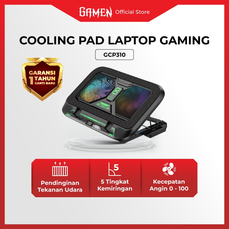 GAMEN Laptop Gaming Cooling Pad GCP310 Kipas 2 Inti 100 Level Fan Speed 3900 RPM Dengan Phone Holder Silent Fan Cooling Pad Laptop Original