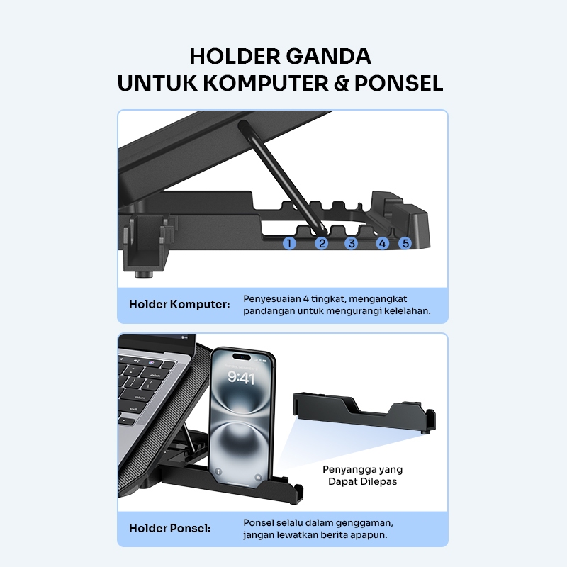 ROBOT Cooling Pad Laptop 10-16 inch Untuk Gaming Kipas 2 Inti Lengkap Dengan Slot HP Tipe Level Fan Speed With Phone Holder Silent Fan RCP10 Original - Garansi 1 Tahun