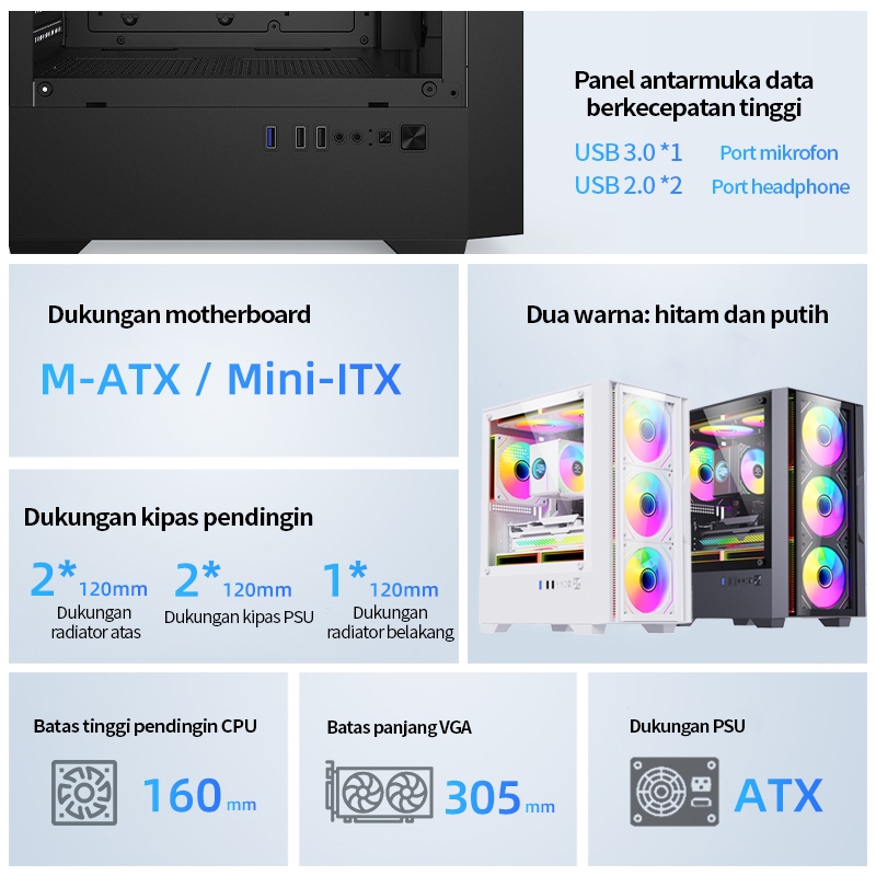 JT PC Casing Gaming Predator case matx RTX 4080S/5090D Komputer Cassing Castle Mini ITX/M-ATX USB 3.0 3Fan ARGB PC with Tempered Glass Case Free Garansi 1 Tahun.