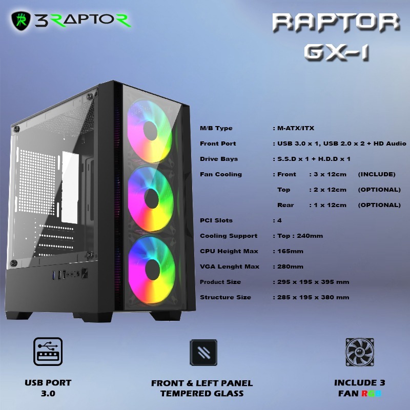 Casing Gaming/PC/Office Raptor GX-1 - Free 3 Fan RGB + USB 3.0
