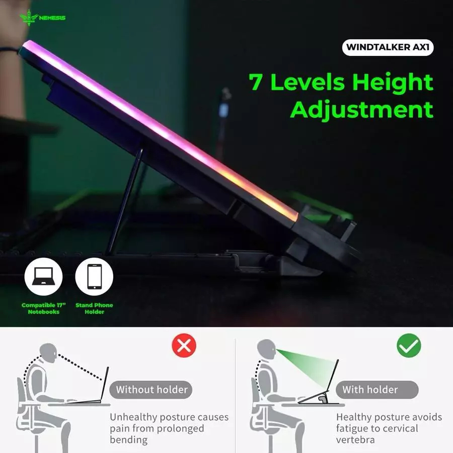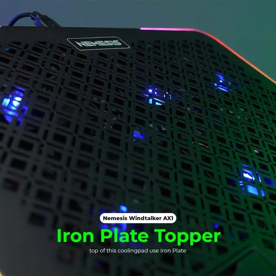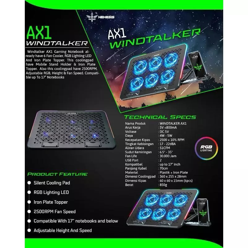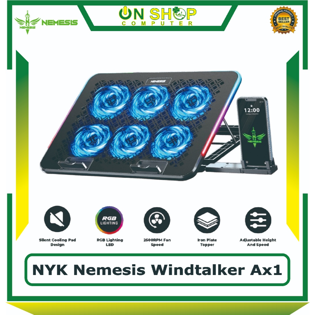 NYK Nemesis Windtalker AX1 RGB Cooling Pad 6 Fan / NYK Nemesis Windtalker AX1 / AX-1 Coolingpad Cooling Pad Fan Lpatop Plat Topper 6 Fan RGB with Phone Holder