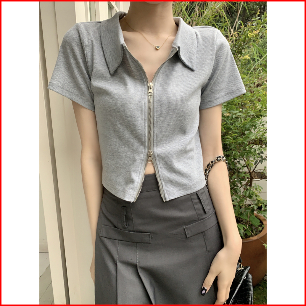 Misco T-shirt Kaos Crop Zipper Wanita Crop Top Lengan Pendek Kaos Wanita Crop Top Kardigan Warna Solid Abu-abu Kaus Crop