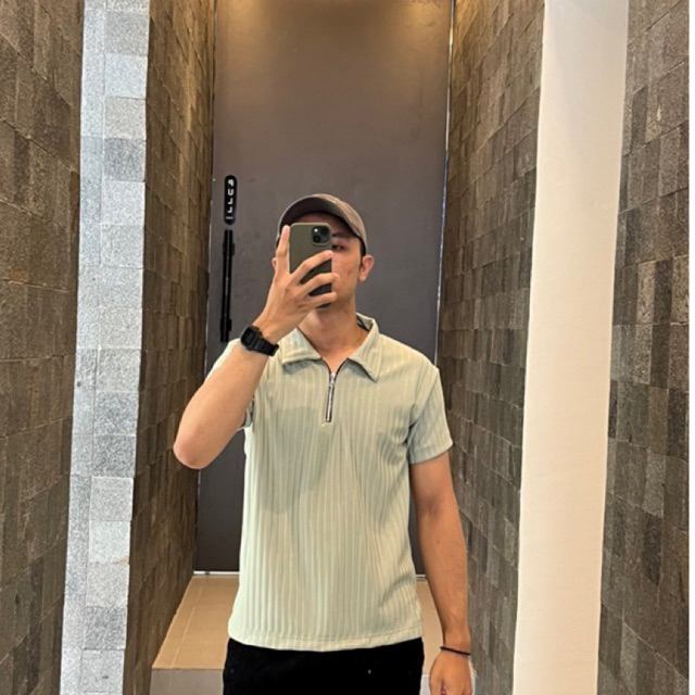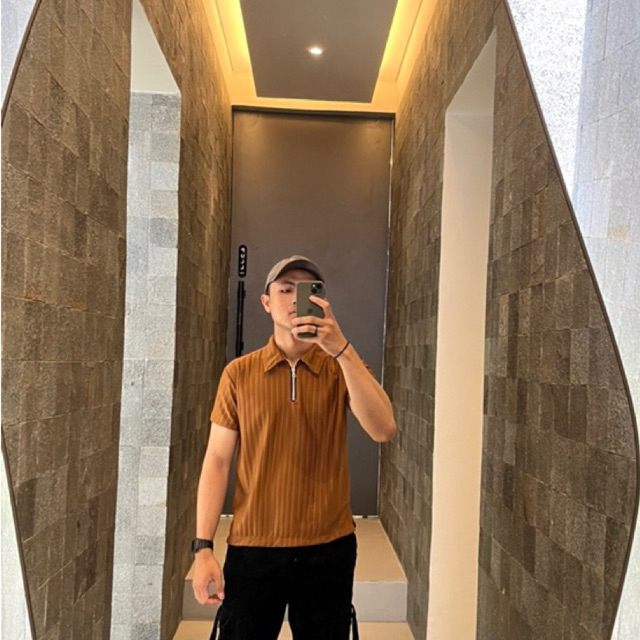 Kaos polo shirt zipper pria Korean Knit baju Polo Shirt Pria Salur Besar resleting Dengan Cutting Slim Fit Kerah Pendek