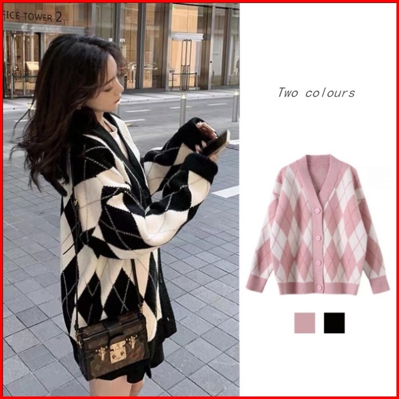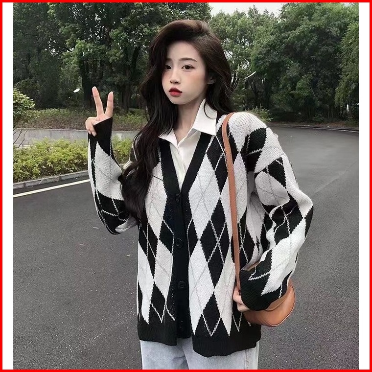 Sweater Kardigan Wanita Jaket Kardigan Lengan Panjang Kotak-kotak Retro Korea