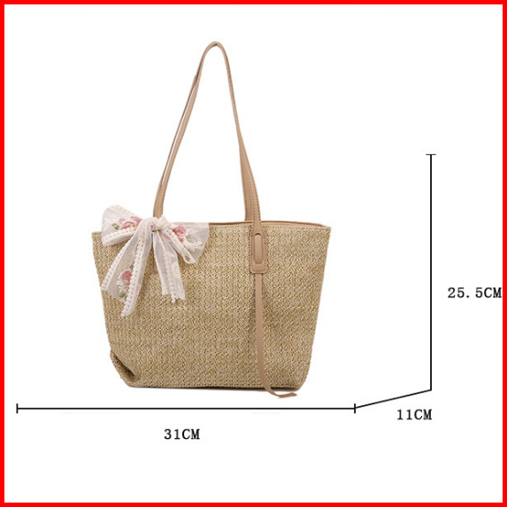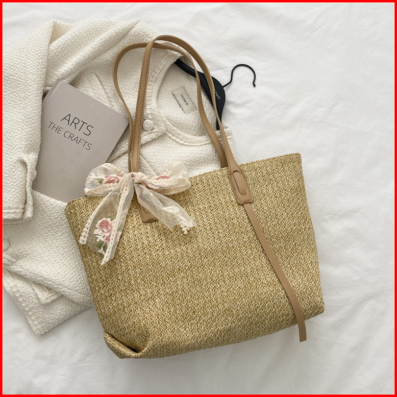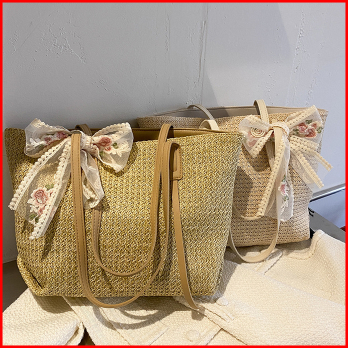 Totebag Kuliah Polos Dengan Pita Vintage Bahan Anyam Jerami Korean Style Import