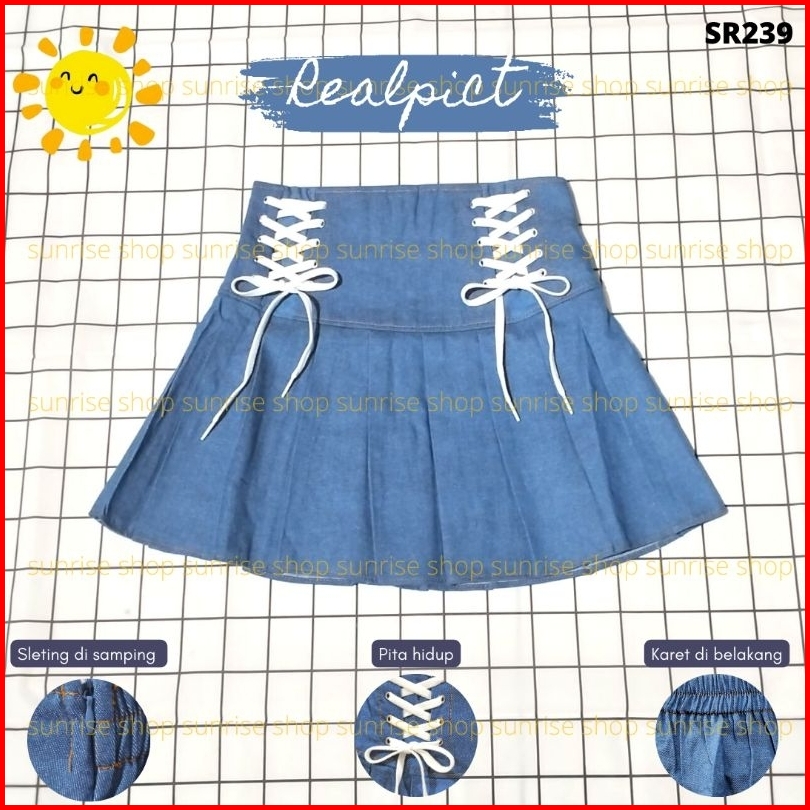 Sr239-double Lace Up Mini Pleated Jeans Skirt Premium