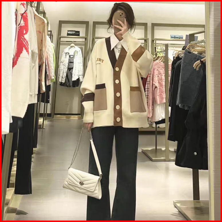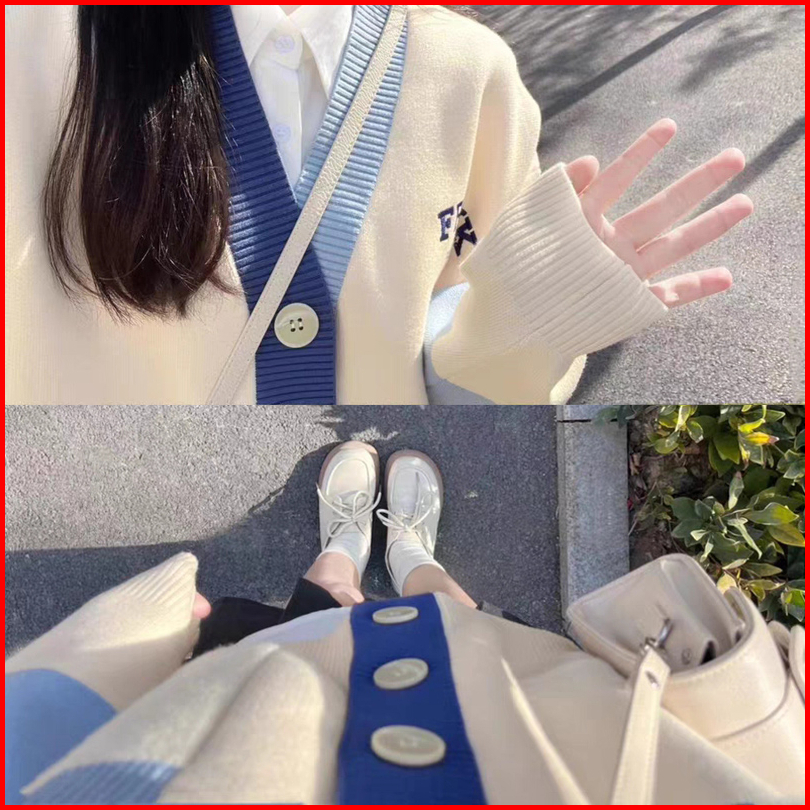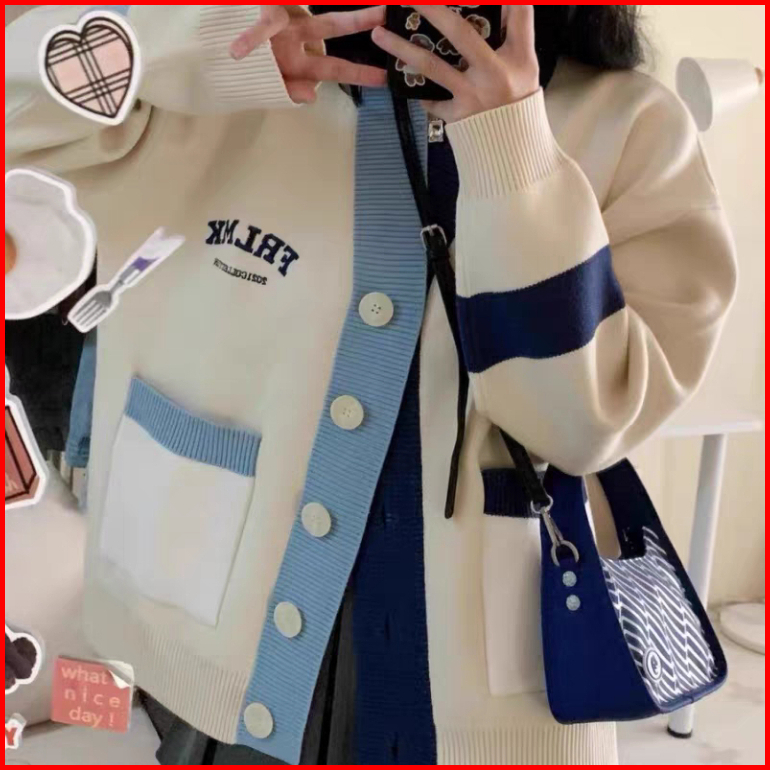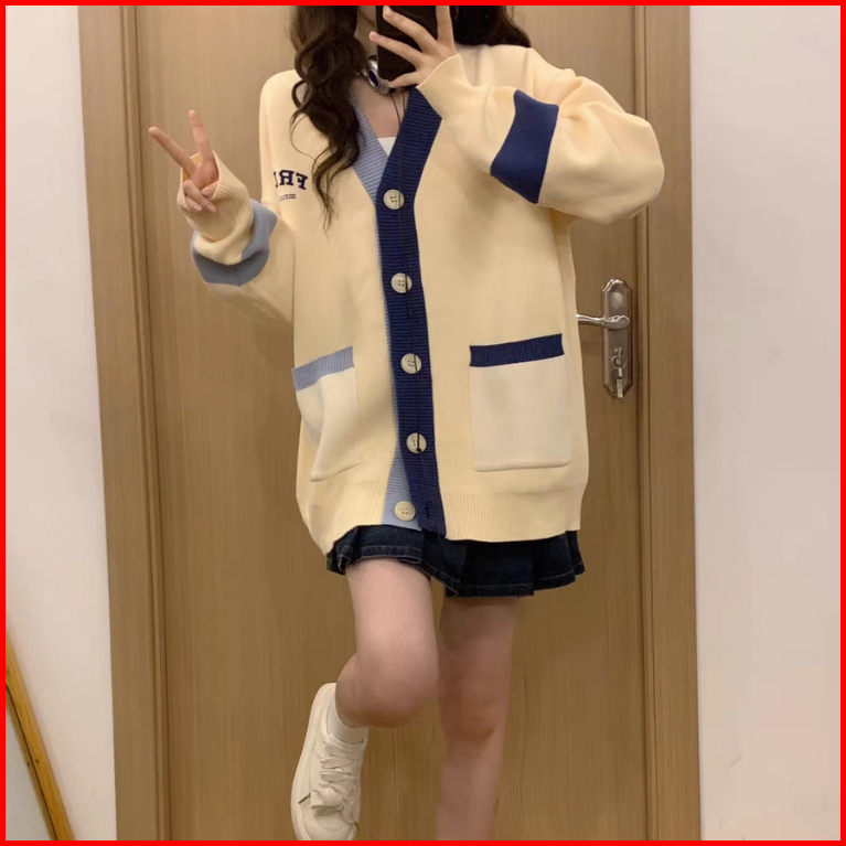 Rajutan Bordir Alfabet Korea Korea Splicing Contrast Color Knitted Cardigan Student Lengan Panjang Sweater Rajut Garis V