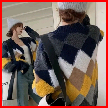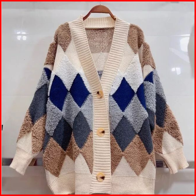 Versi Korea Kotak-kotak Rajutan Cardigan Wanita Lengan Panjang Warna Kontras Sweater Retro Longgar Pakaian Luar Leher V