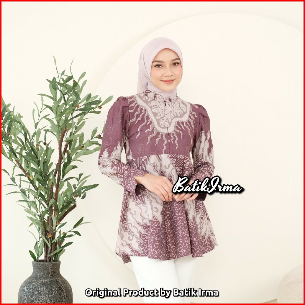 Atasan Batik Wanita Modern Blouse Peplum Lengan Puffy Resleting Depan Blouse Batik Seroja Batik Irma