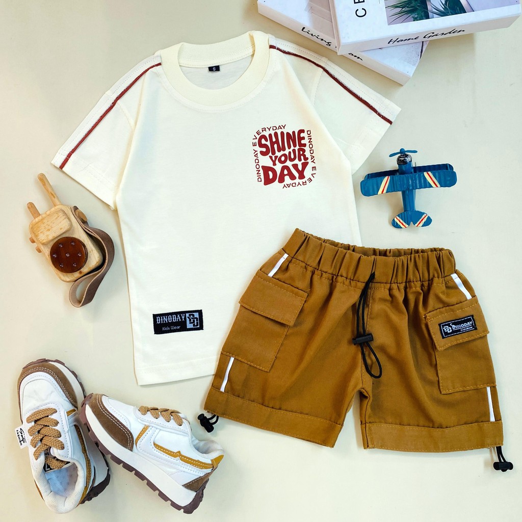 ESTISHOP X DINODAY Setelan Anak Laki Laki Perempuan Baju Kaos Distro Shine Your Day Celana Cargo Premium
