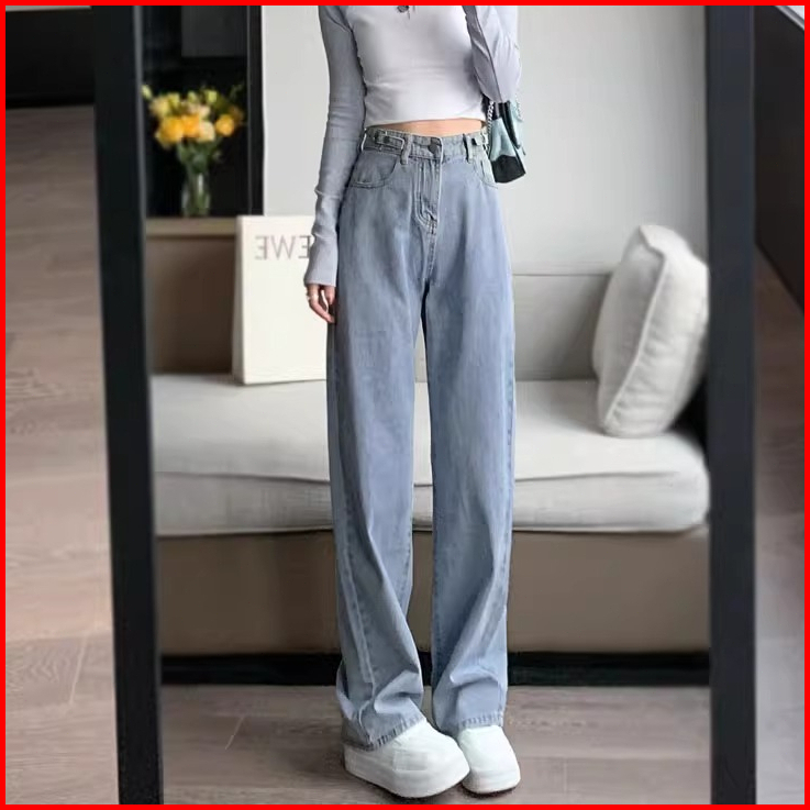 Korean Celana Jeans Haigh Waist Wanita Biru Muda Celana Jeans Baggy