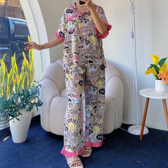 SETELAN CELANA PANJANG LENGAN PENDEK / PIYAMA RAYON PREMIUM ONESET DEWASA / VEVE SET BAJU WANITA - VEVE 2, ALLSIZE