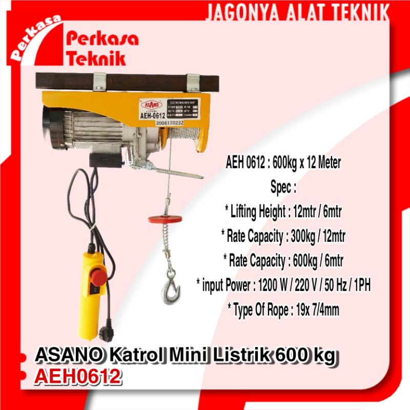 Electric Hoist ASANO AEH0612 Katrol Mini Listrik 600 kg Wire Rope 12 mtr