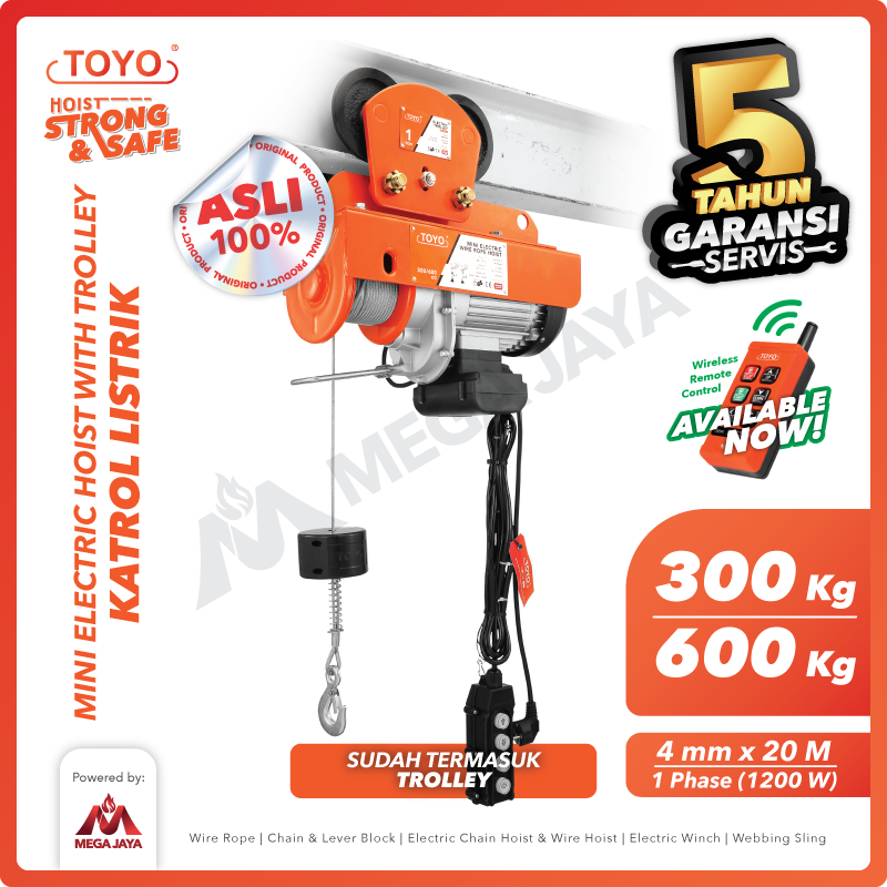TOYO Mini Electric Hoist Trolley set / Katrol Listrik 300/600Kg x 20M