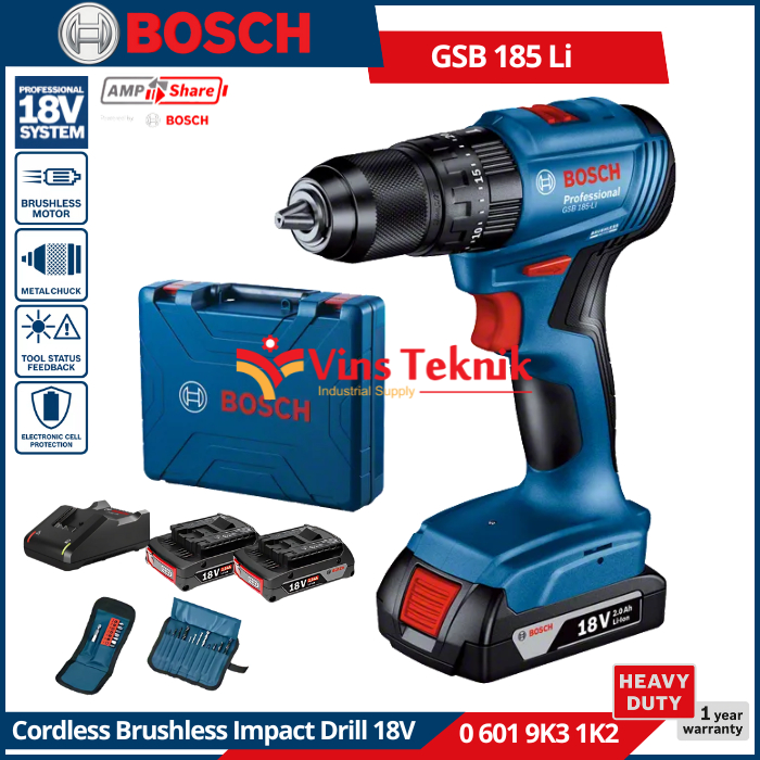 Brushless Impact Drill 18V Mesin Bor Tembok Baterai BOSCH GSB 185 LI + Aksesories