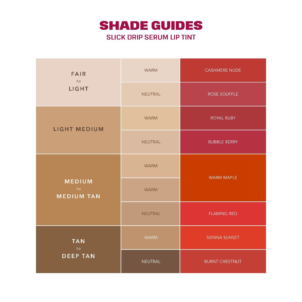 Cashmere Nude, Rose Souffle, Royal Ruby, Flaming Red, Bubble Berry, Sienna Sunset, Warm Maple, Burnt Chestnut