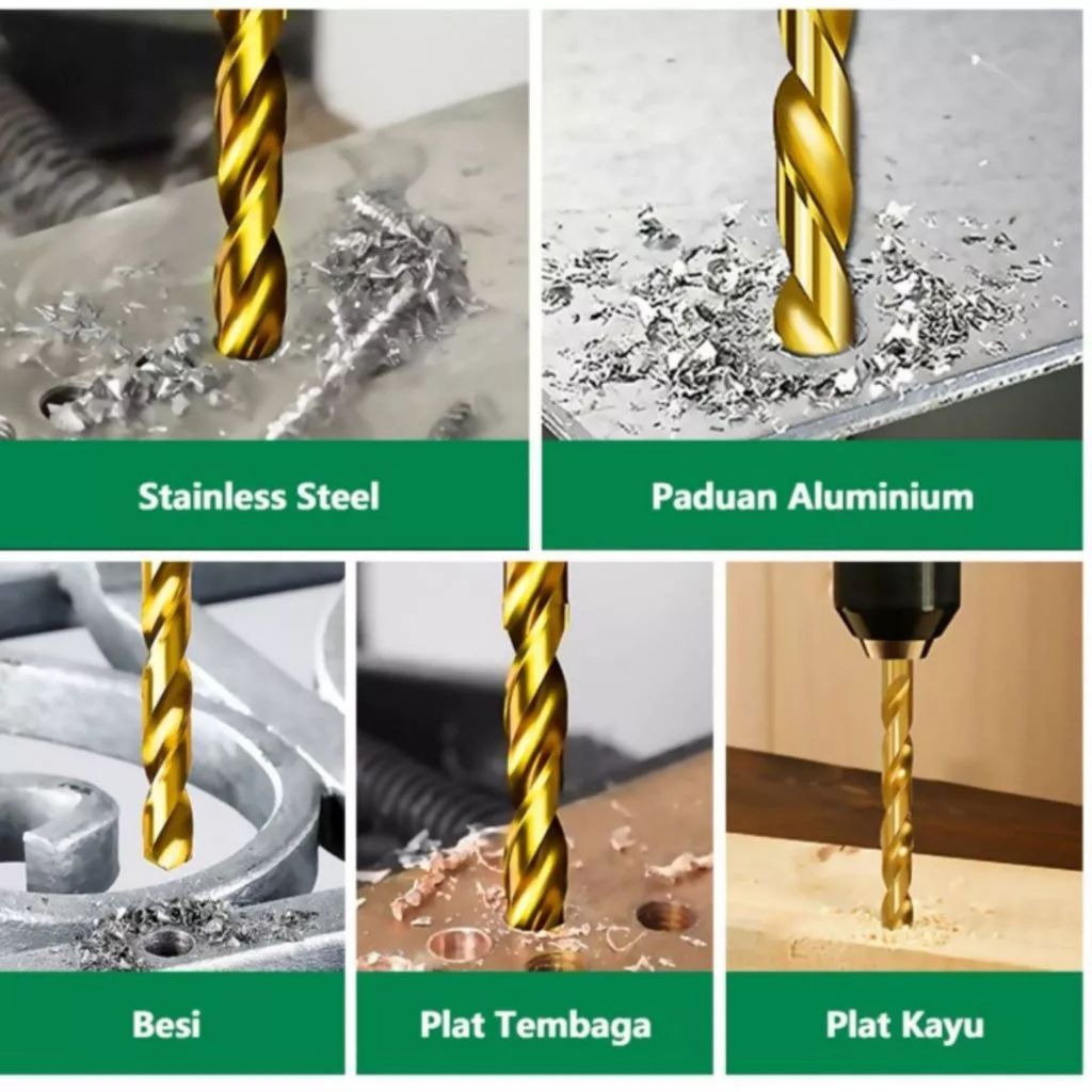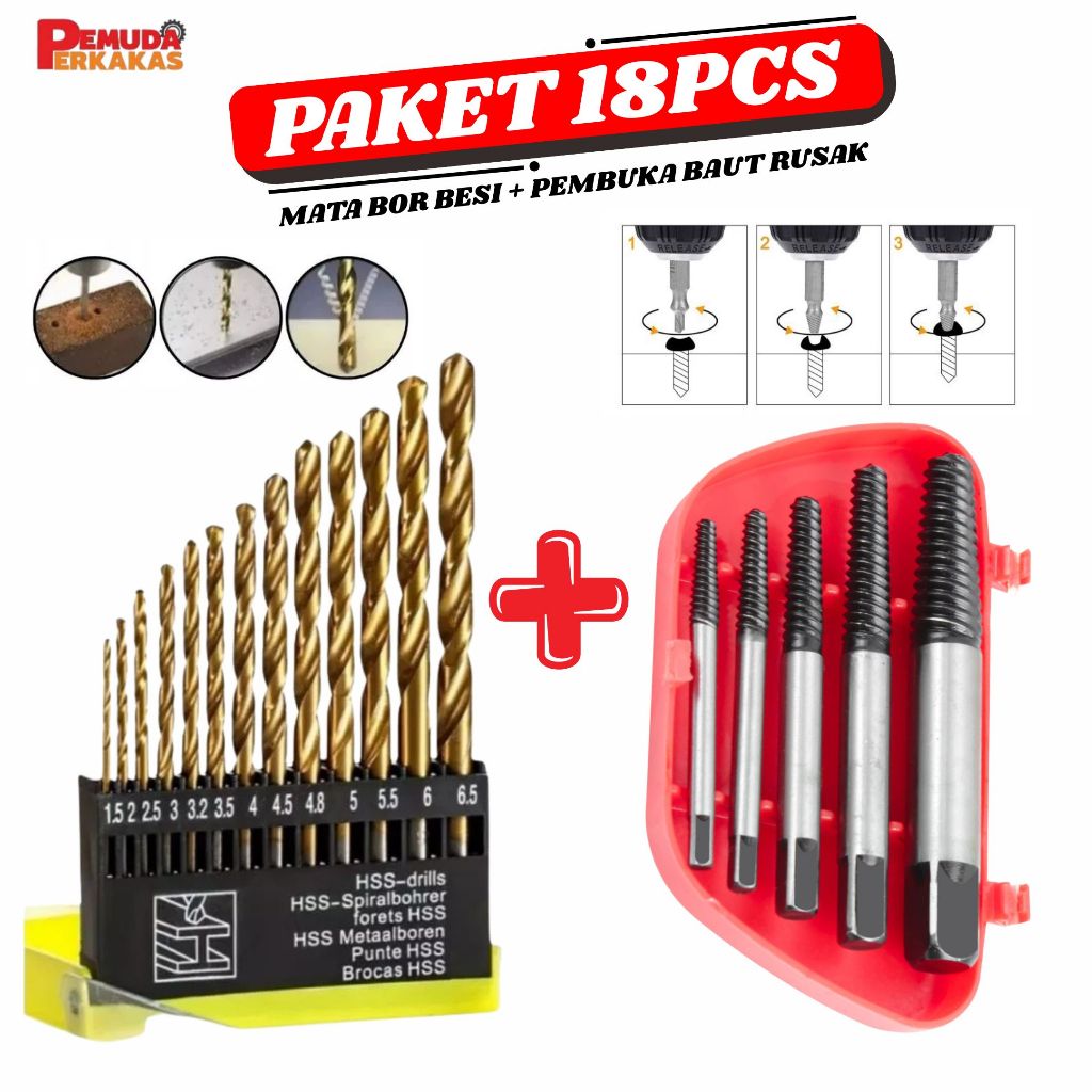 Paket HSS-Drills 18pcs Mata Bor Besi Baja Titanium Power Drill Steel Hex Shank & 5 in 1 Broken Screw Remover Screwextrac