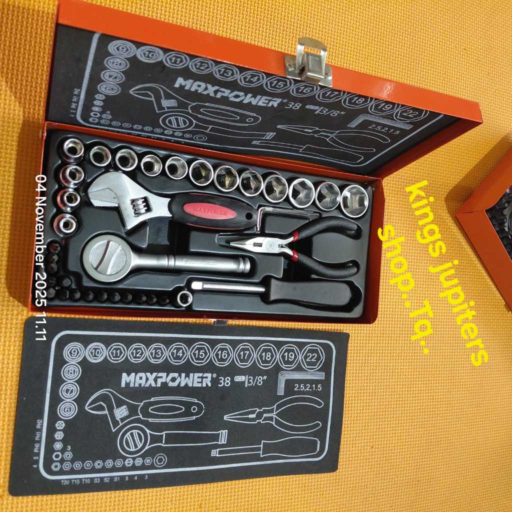 HEAVY DUTY 3/8dr MILI set 38pc KUNCI SOK 6MM sd 22MM 6PT merk MAXPOWER + TANG + RECET + INGGRIS + MATA L OBENG + SOCK SO