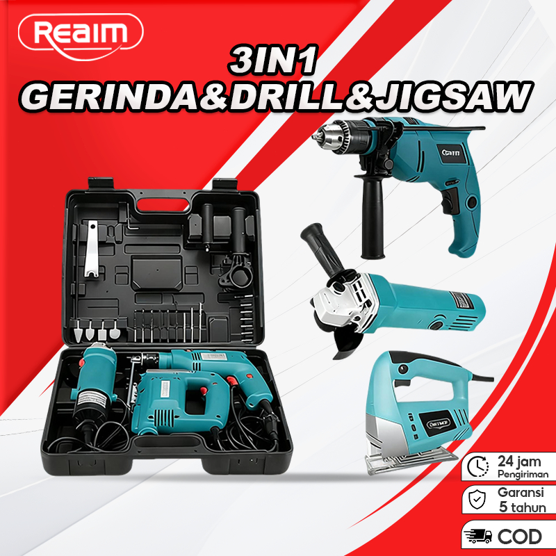 REAIM Mesin Gerinda Sudut Set 3 in 1 Bor Dampak dan Gergaji Gulung dengan Kasing Keras