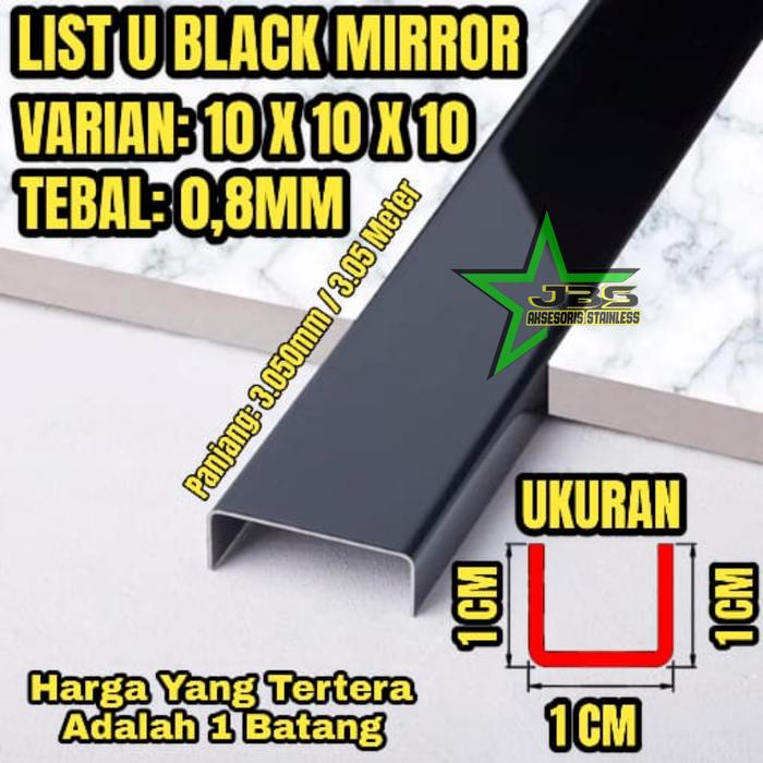 LIST U MIRROR BLACK (KILAP) VARIAN TEBAL 0.8MM PANJANG 3.050MM (3MTR) STAINLESS SS 201 - 10X10X10X3.050MM