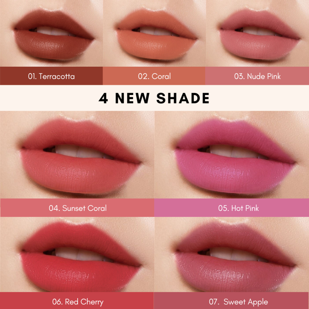 01 Teracotta, 02 Coral, 03 Nude Pink, 04 Sunset Coral, 05 Hot Pink, 06 Red Cherry, 07 Sweet Apple
