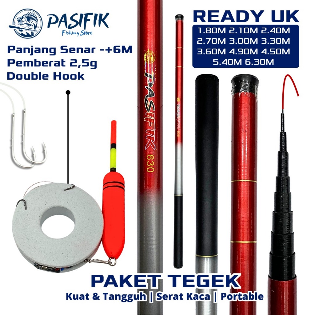 Paket Set Joran Tegek Pancing Bahan Serat Kaca dengan Kail Double Hook Senar Pelampung dan Pemberat
