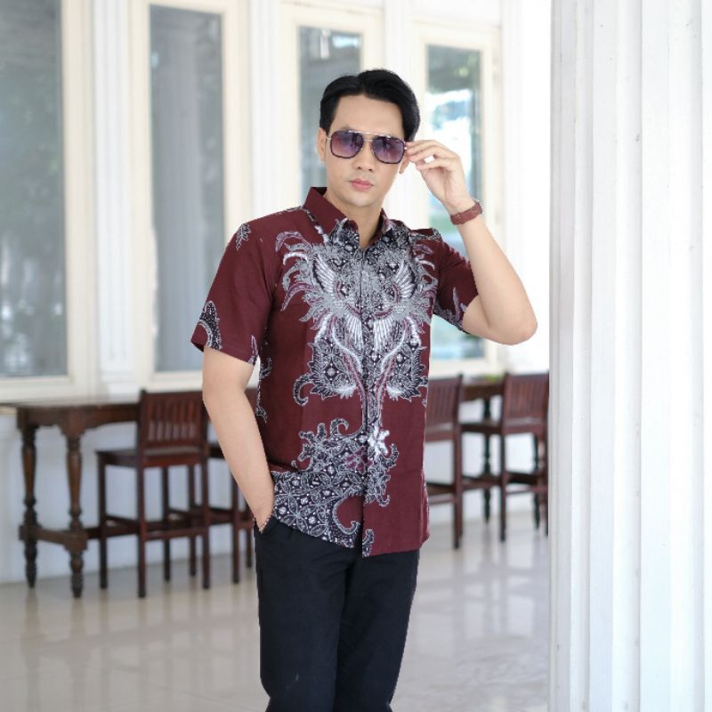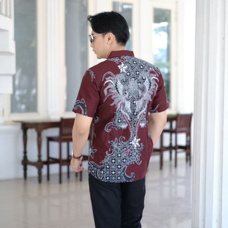 Warna Merah Bergundi Kemeja Batik Pria Slimfit Lengan Pendek Lapis furing Motif Bergundy Baju Batik Pria Slimfit Jumbo