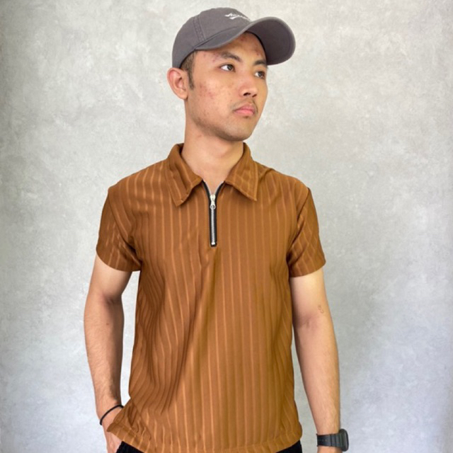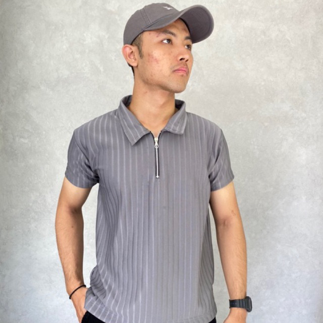 Kaos polo shirt zipper pria Korean Knit baju Polo Shirt Pria Salur Besar resleting Dengan Cutting Slim Fit Kerah Pendek