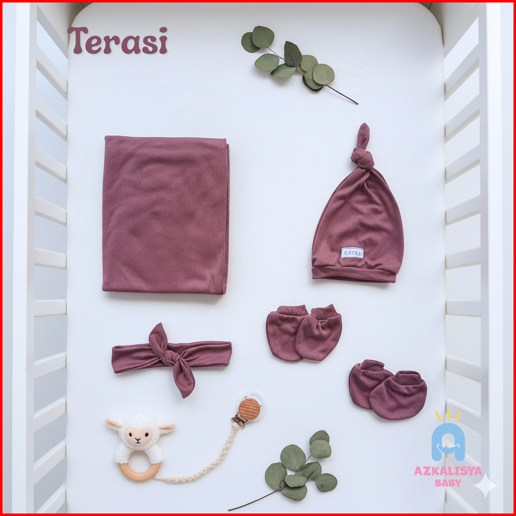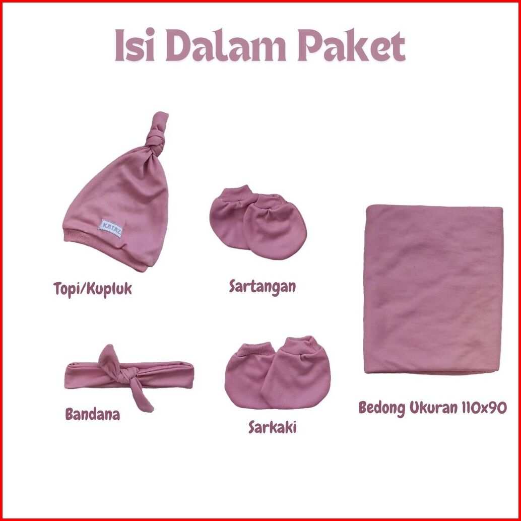 Paket Baby Newborn 5in1 Bedong Bando Topi Sarung Tangan Kaos Kaki Bayi Baru Lahir Perempuan Dusty