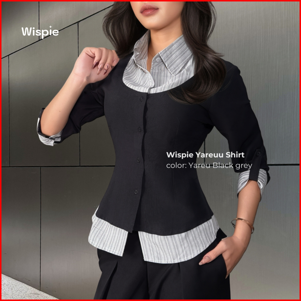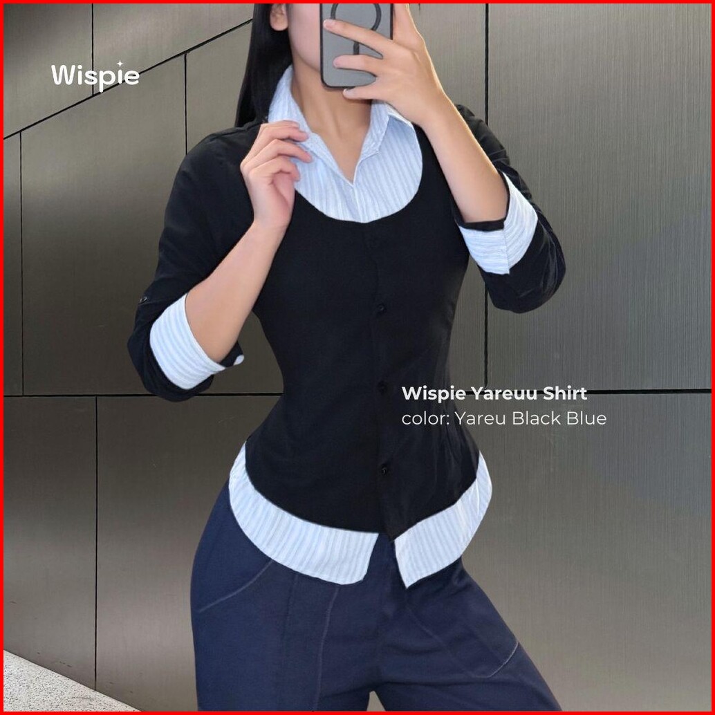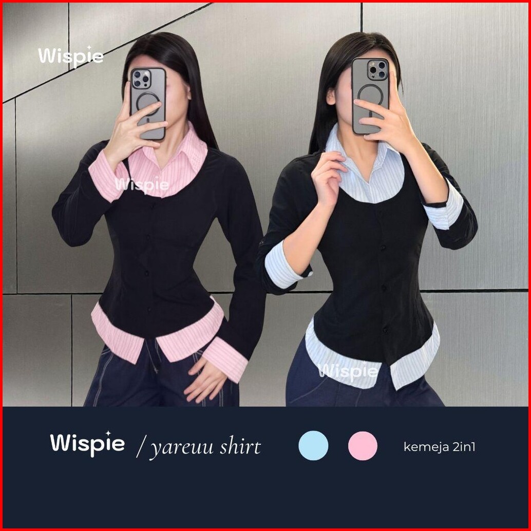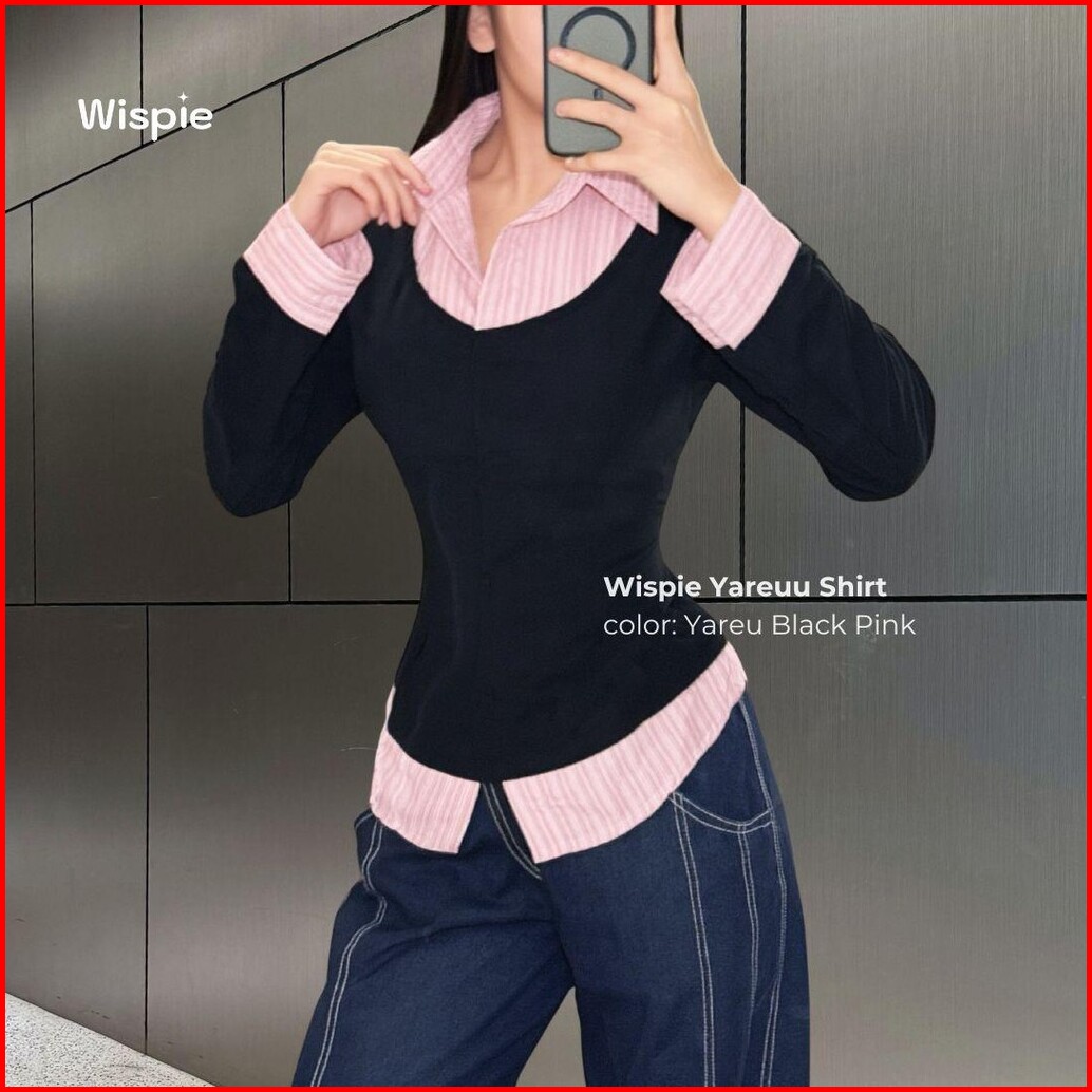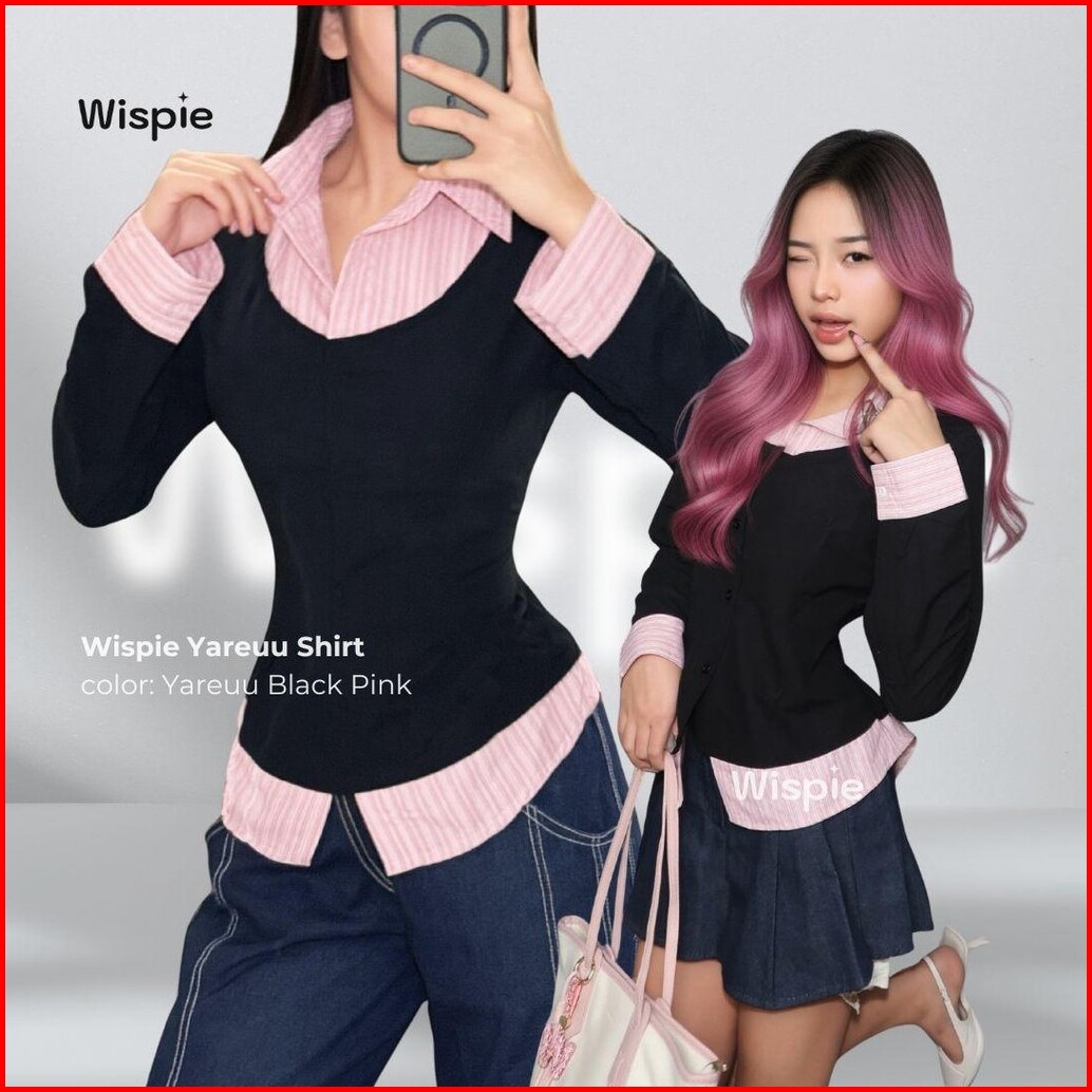 Wispie Yareuu Shirt Kemeja Fitted Blouse Wanita Kombinasi Layer Warna Biru Pink Kemeja 2in1