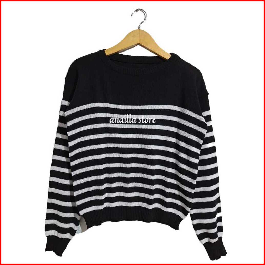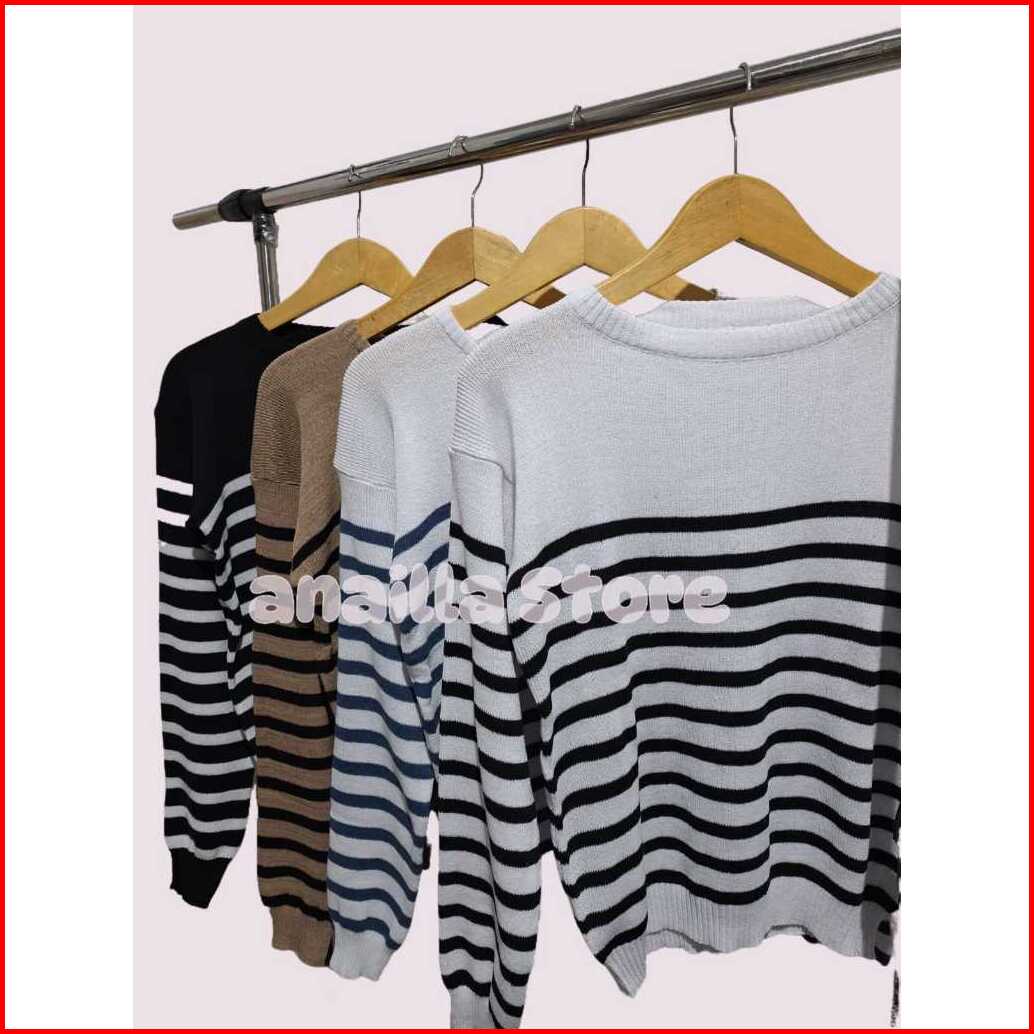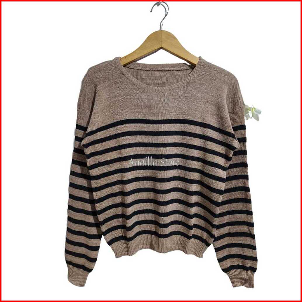 Anailla Atasan Rajut Stripes Oneck Blaster Top Knit Lengan Panjang Premium