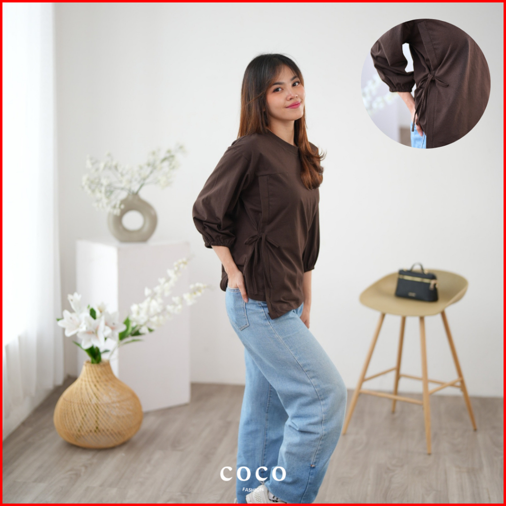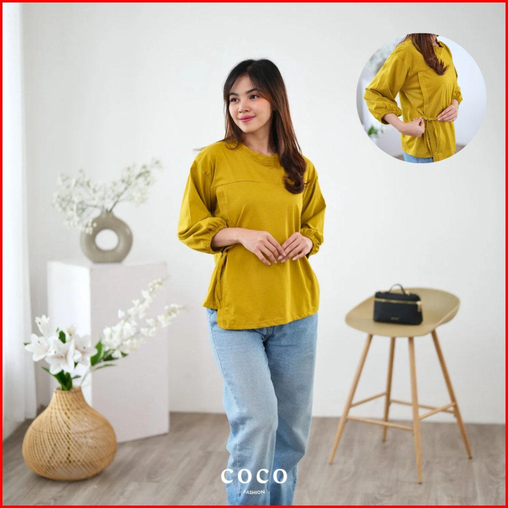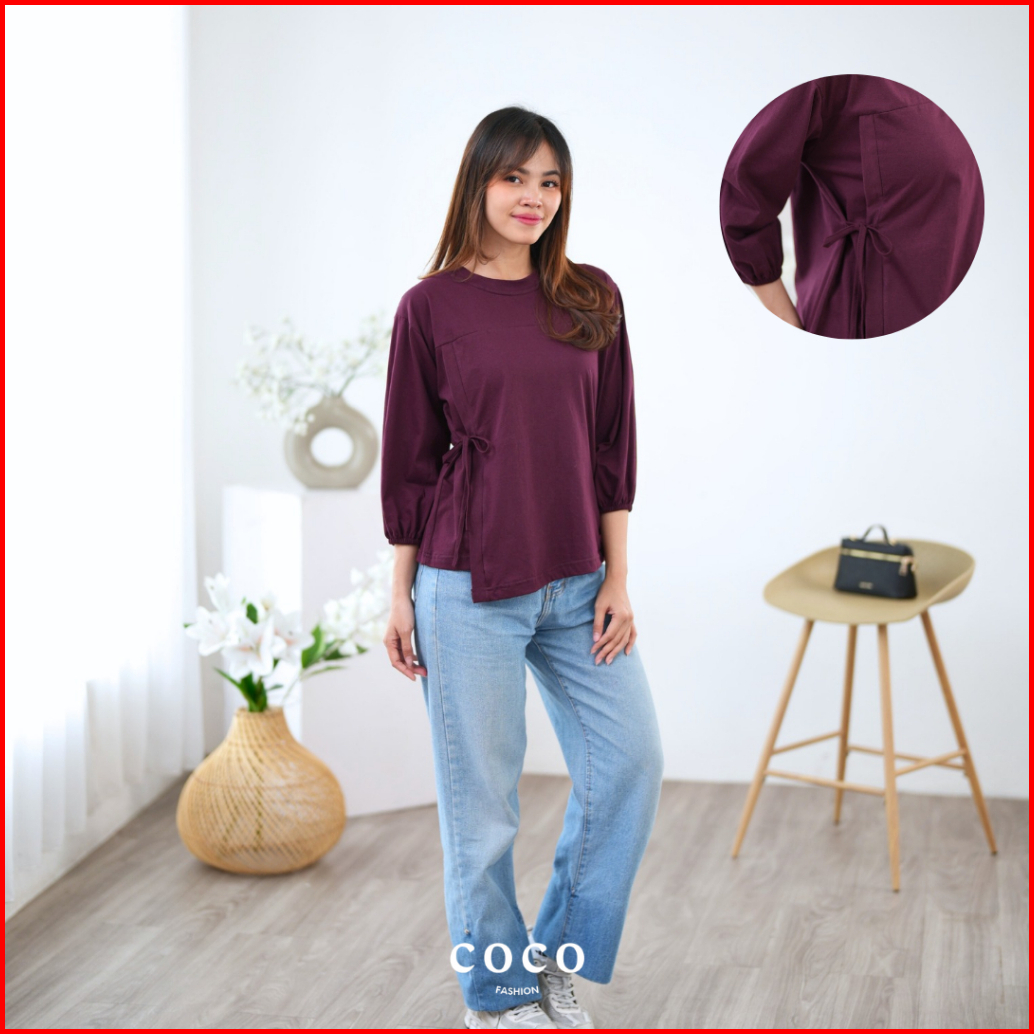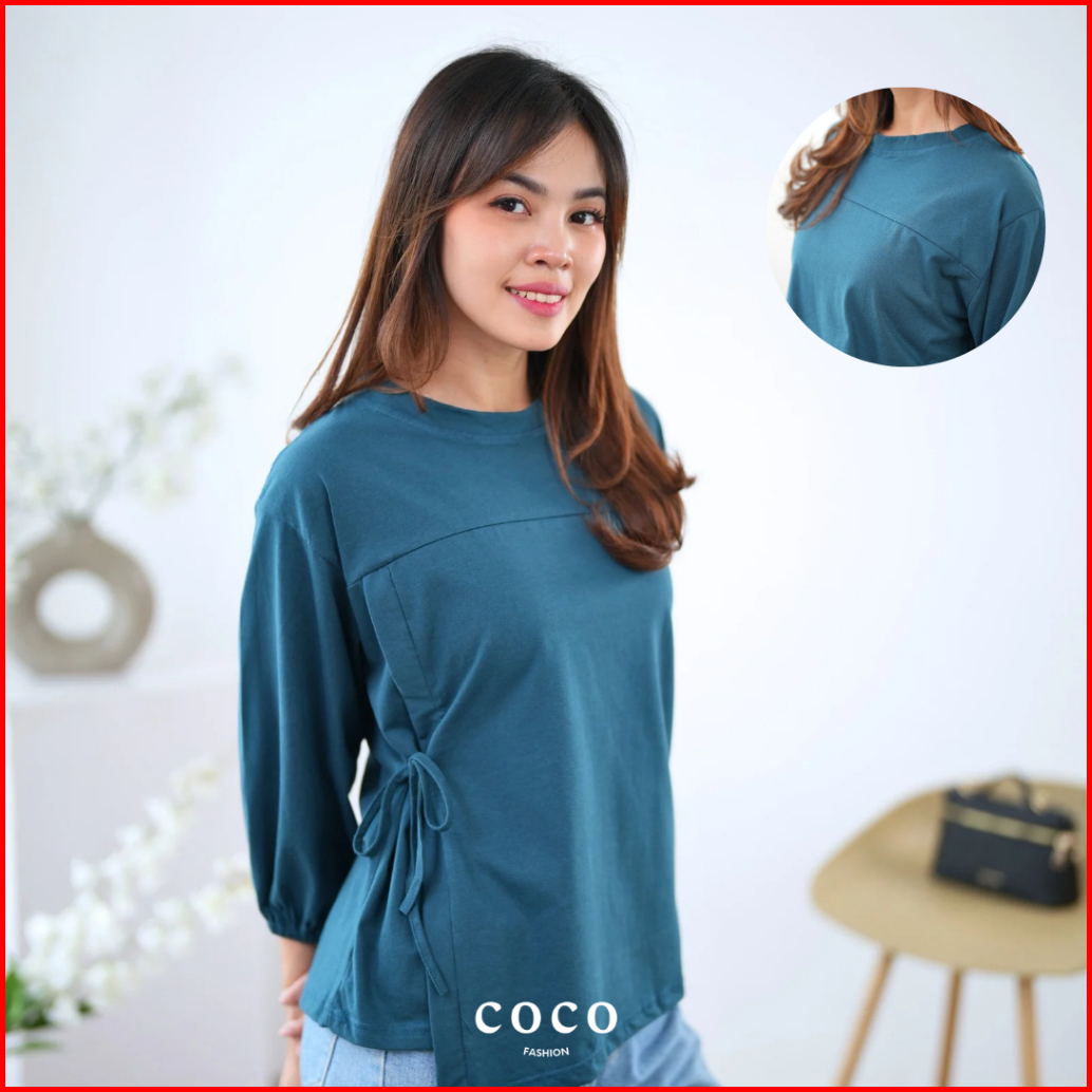 Atasan Wanita Kaos Lengan 7 8 Tali Pita Ikat Samping Mia Top Korean Elegant Style Cotton Combed Premium Size M L Xl Mode