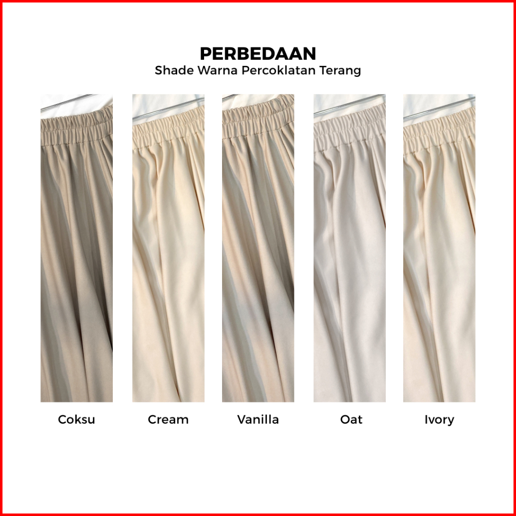 Hitam, OAT, CREAM, IVORY, COKSU, Vanila, Khaki, Choco, PRAMUKA, COFEE, PUTIH TULANG, ABU DEBU, ABU SILVER, Abu Tua, NAVY MUDA, NAVY TUA, BIRU CORAL, BIRU WARDAH, Stell Blue, DALGONA, Butter, MILO, MOCCA, MAROON TUA, CHEWSEWNUT, SKY BLUE, BIRU SILVER, ARMY TUA, SAGE MUDA, HIJAU BOTOL, SAGE TUA, GREENTEA, Dusty Pink, PEACH, Lilac, DUSTY UNGU, MAGENTHA, BURGUNDY, MERAH CABE, Mustard, DIJON, HITAM BUNGA, ORCHID, APRICOT, MAROON MUDA, Mahogani