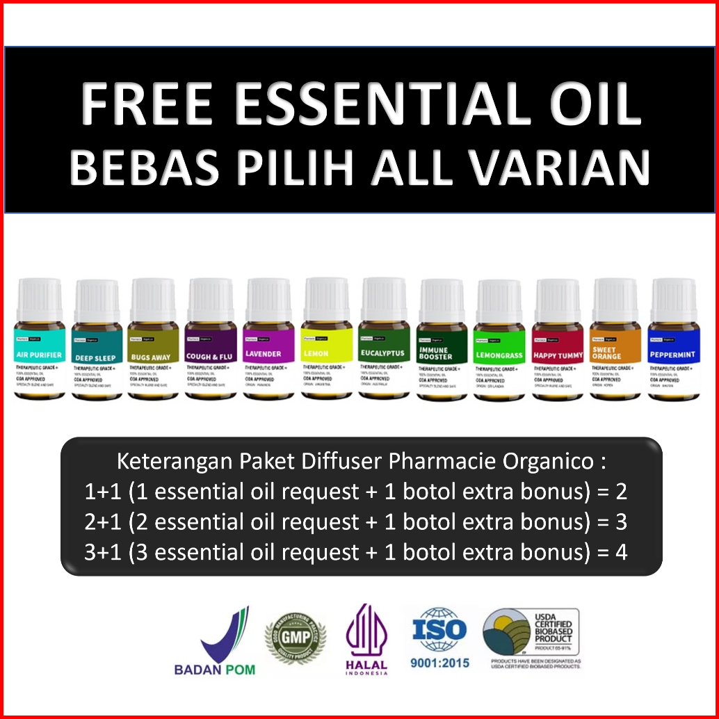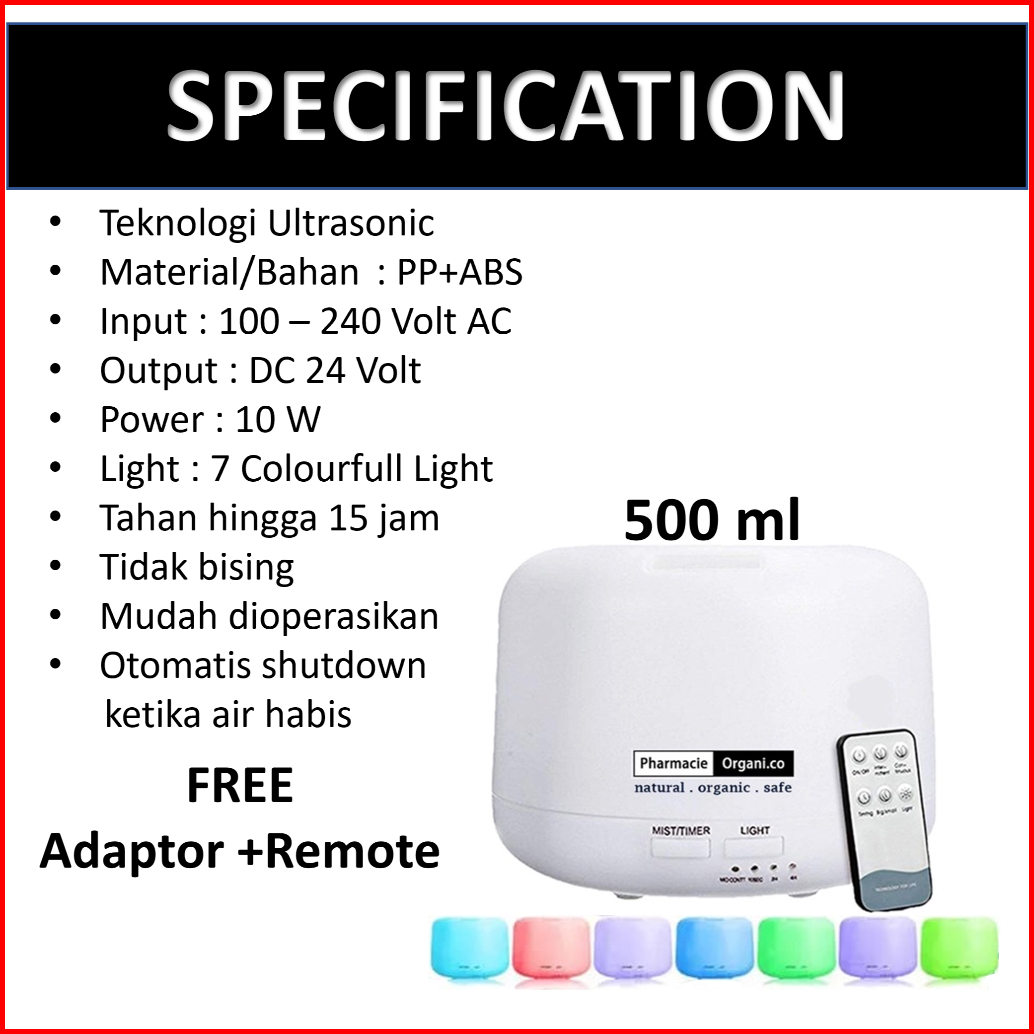 Diffuser Humidifier Aromatherapy 500ml Free 4 Essential Oil 10ml By Pharmacie Organico Garansi Seumur Hidup