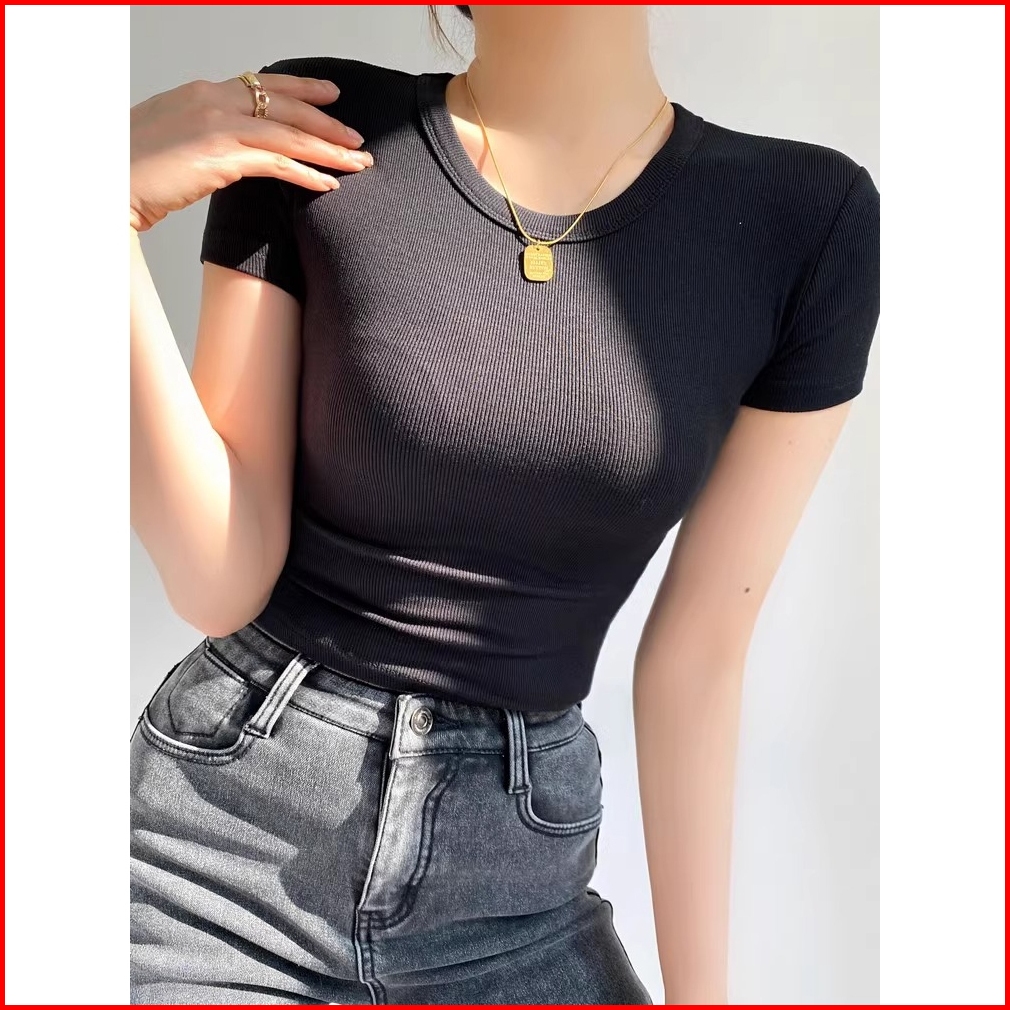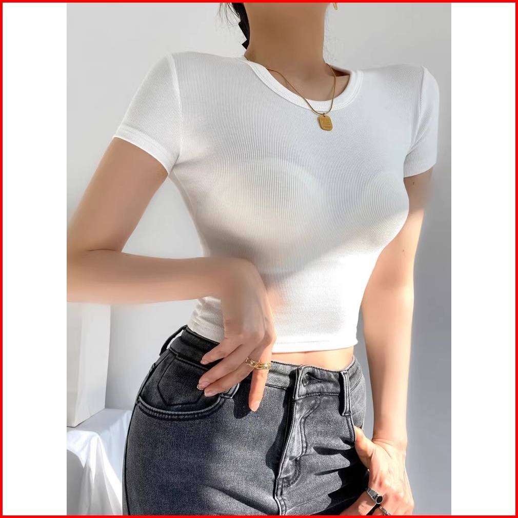 Premium Korea Import Basic Polos Crop Rib Kaos Kaos Polos Crop Wanita Atasan Melar Slim Fit Seksi Wanita