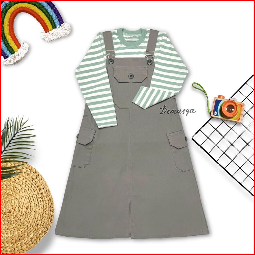 Setelan Overall Anak Kekinian Jumpsuit Rok Katun Anak Overall Rok Panjang Cargo Terbaru Kaos Stripe Belang Tangan Panjan
