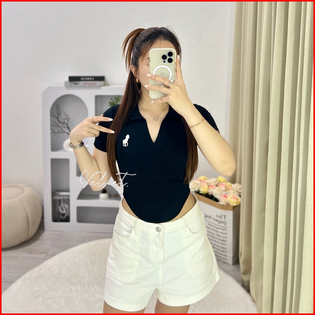 Crop Top Colar Oval Wanita Crop Top Kerah Lengan Pendek Wanita 6070
