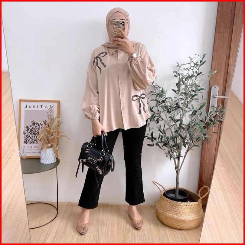 Lena Kemeja Pita Bordir Korean Style Oversize Trendy Kemeja Wanita Oversize Bordir Pita