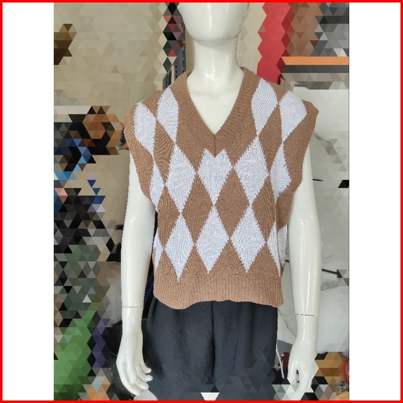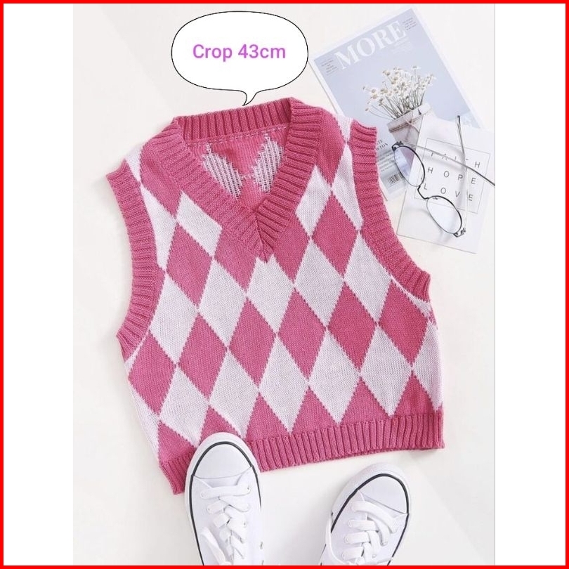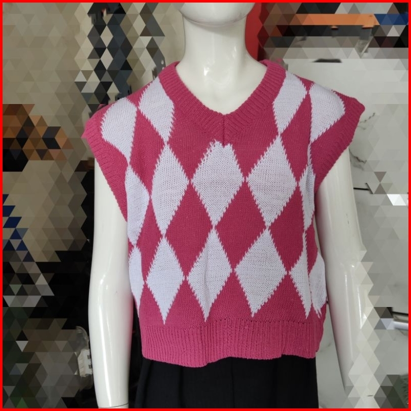 Vest Rajut Crop Argyle Motif Ketupat Rompi Rajut Wanita Crop Korean Style Outer Crop