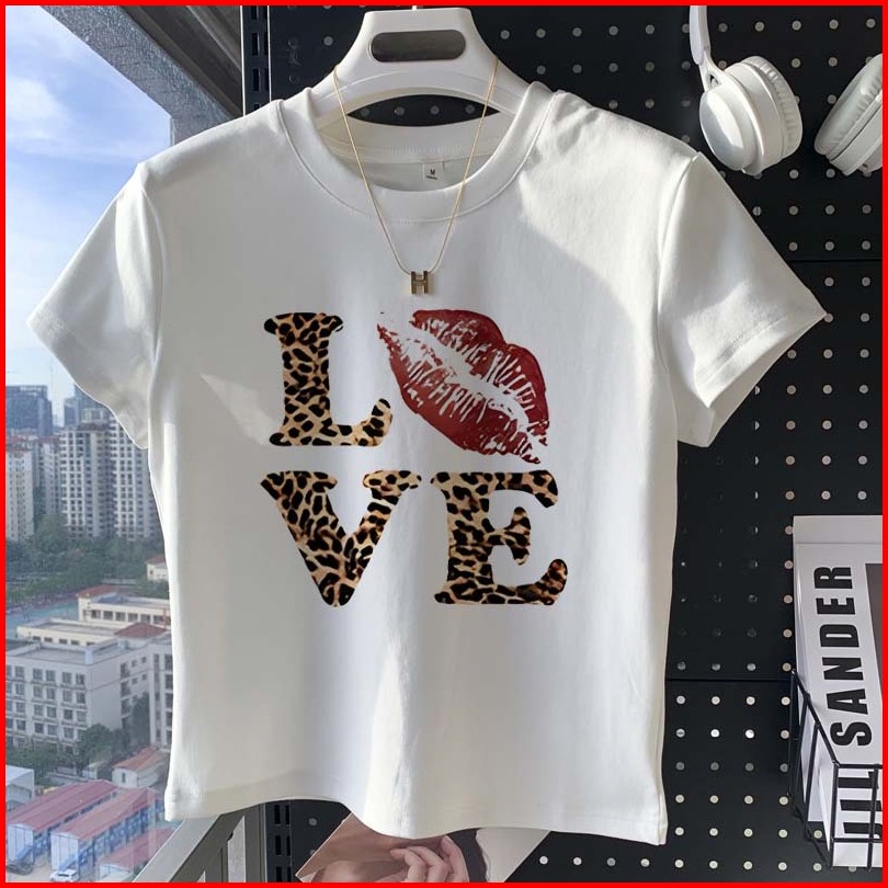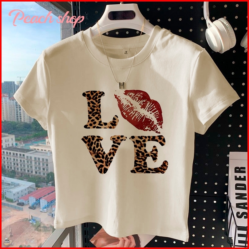 Peach Fashion Macan Tutul Love Kaos Crop Top Wanita Y2k Baju Croptee Korea
