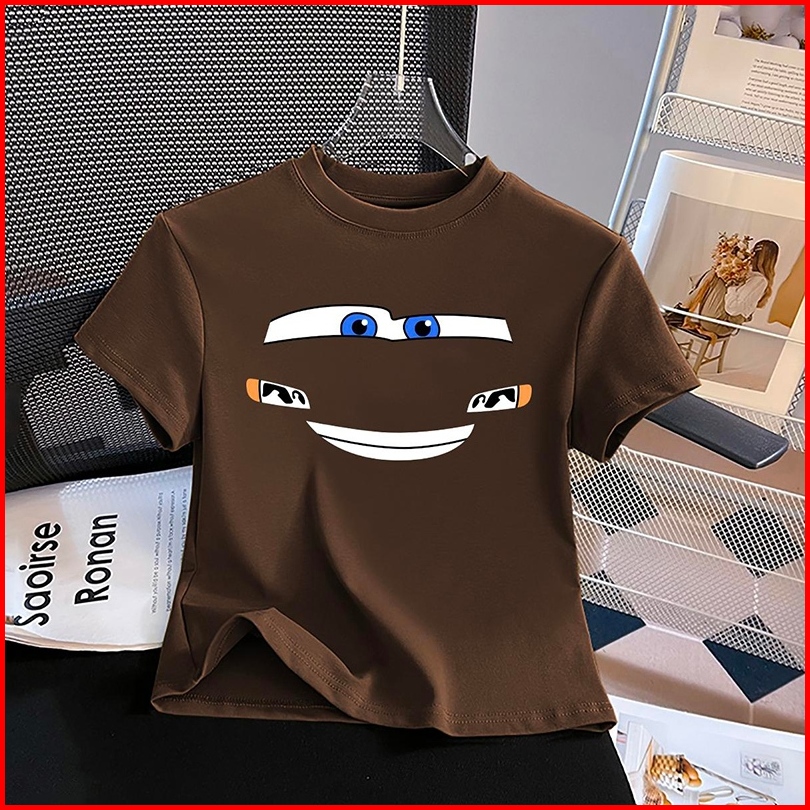 Kaus Ketat Lengan Pendek Bermotif Lightning Mcqueen Wanita Berwarna Coklat Baru