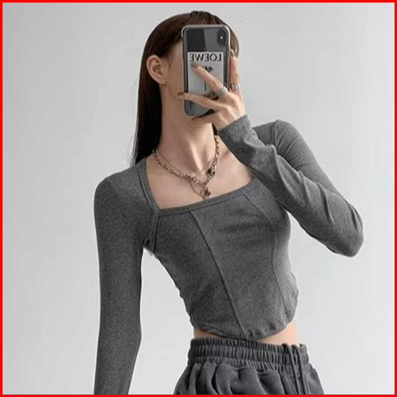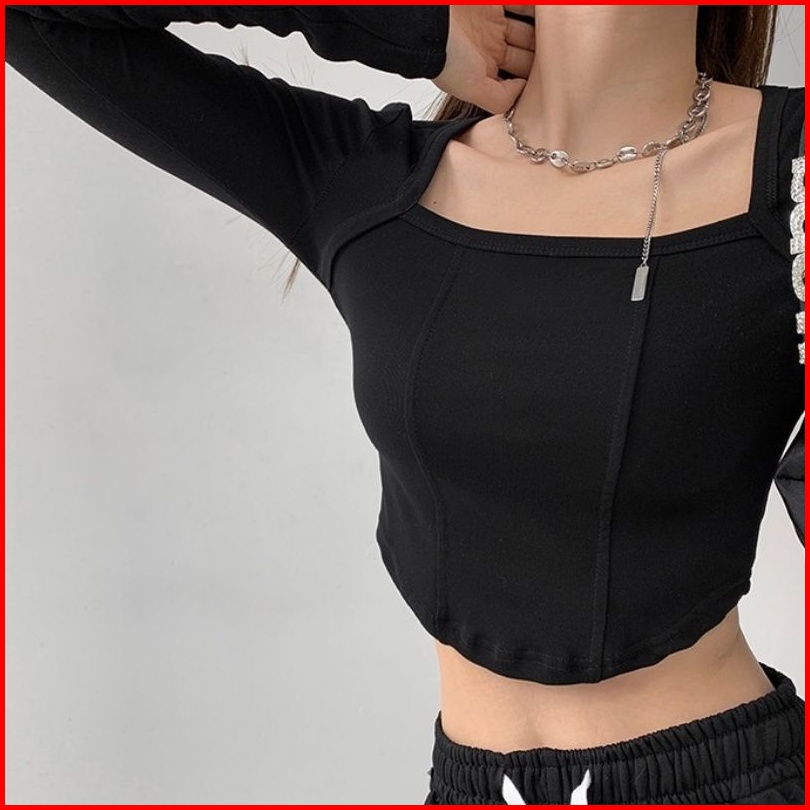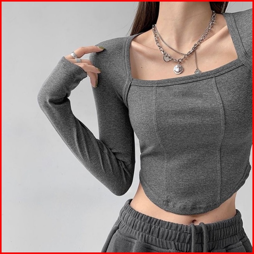 Kaos Crop Lengan Panjang Leher Kotak Crop Top Long Sleeve