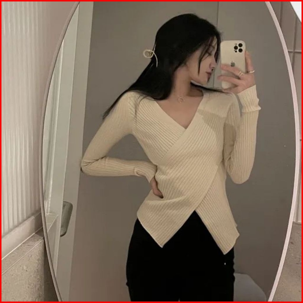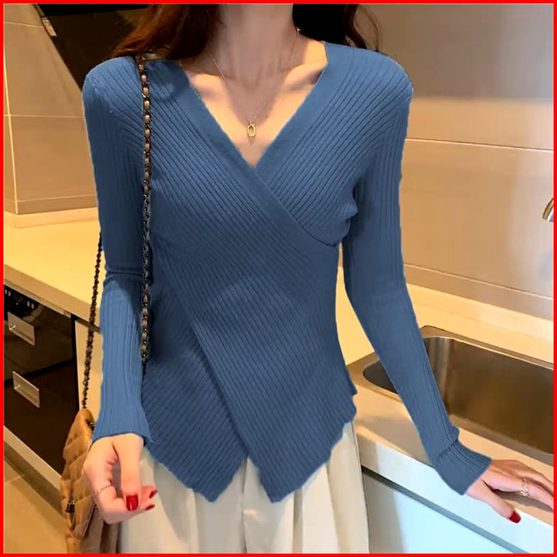 Top Knit V-neck Korean Style Wrap Top - Atasan Rajut Wanita Lengan Panjang