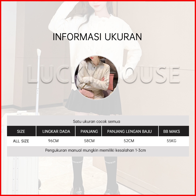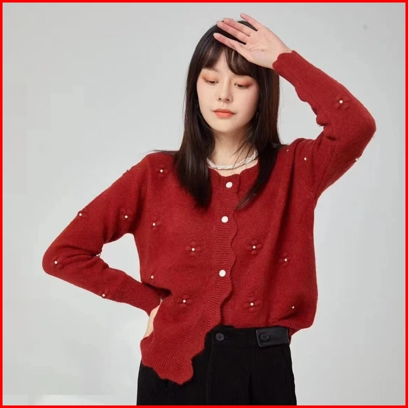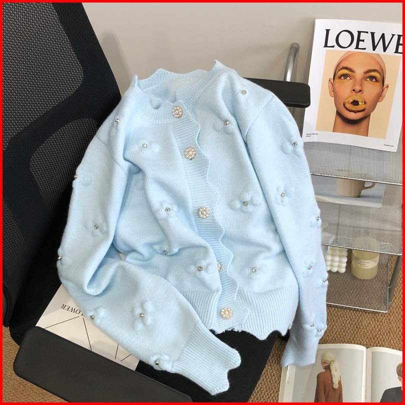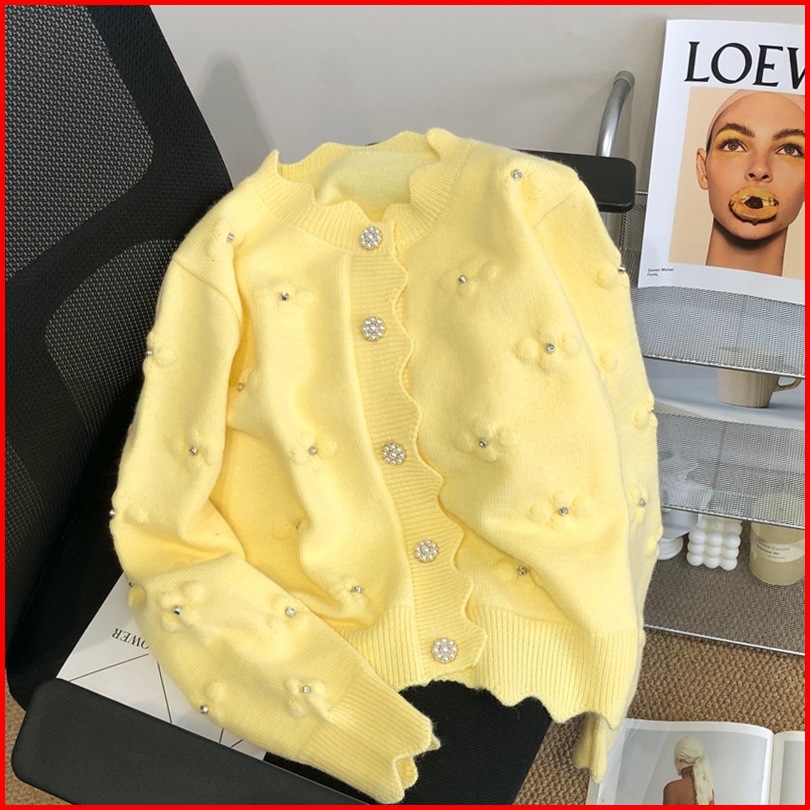 Cardigan Wanita Rajut Korea Bunga Timbul Bunga Polos Crew Neck Kardigan Lembut Manik Mutiara