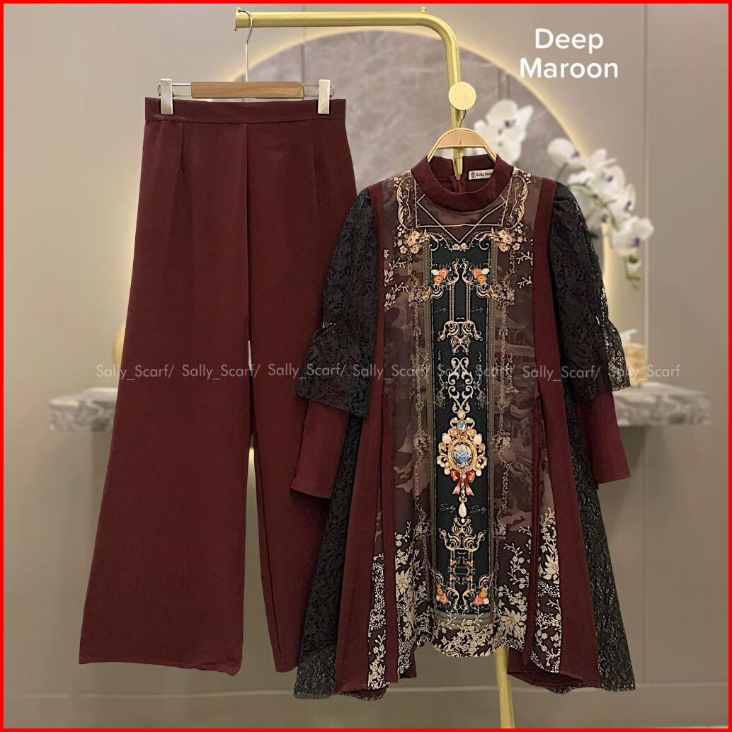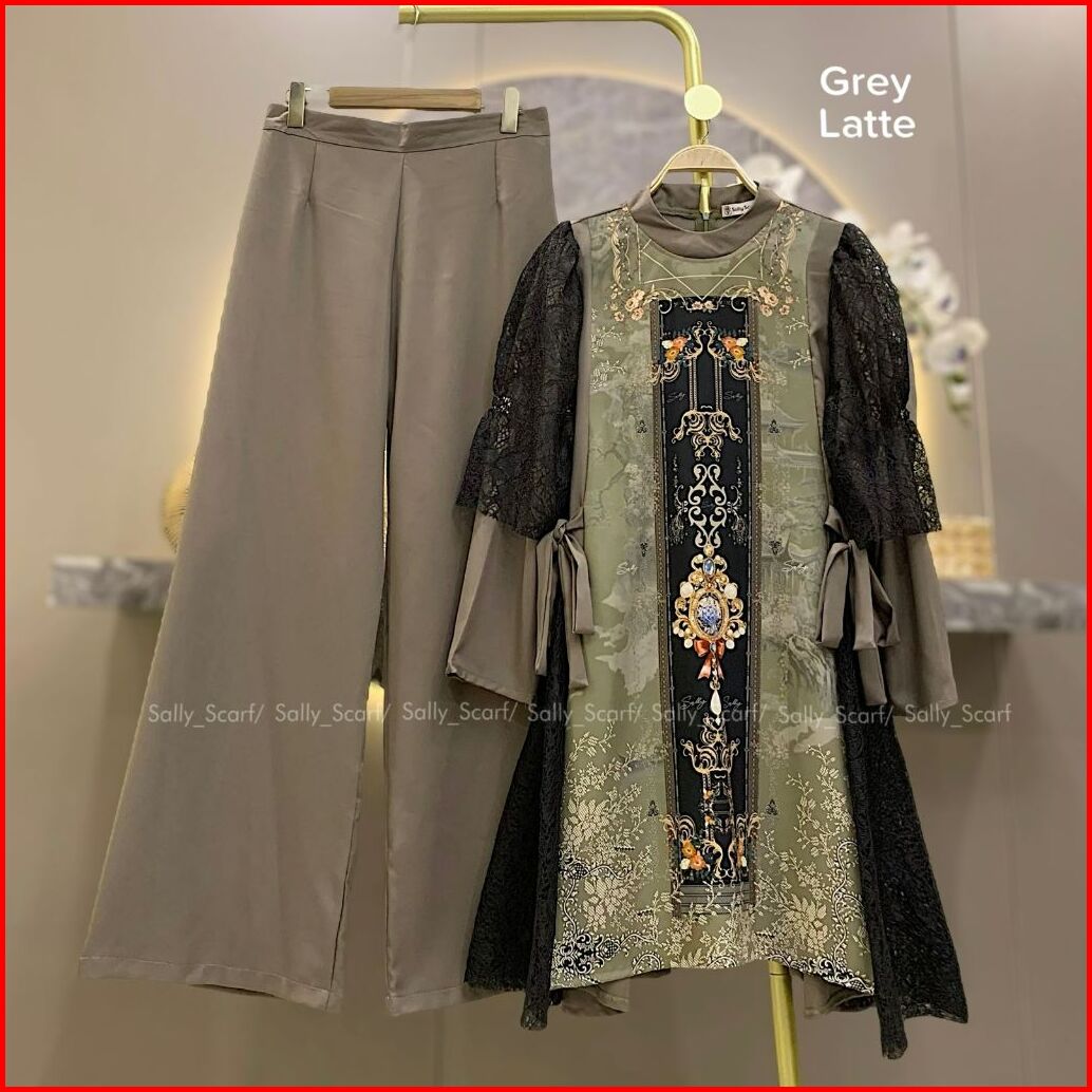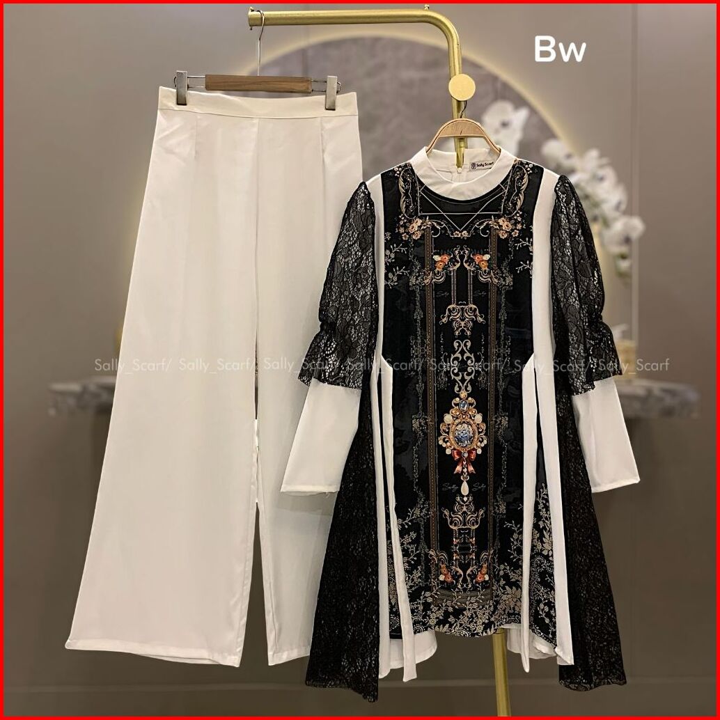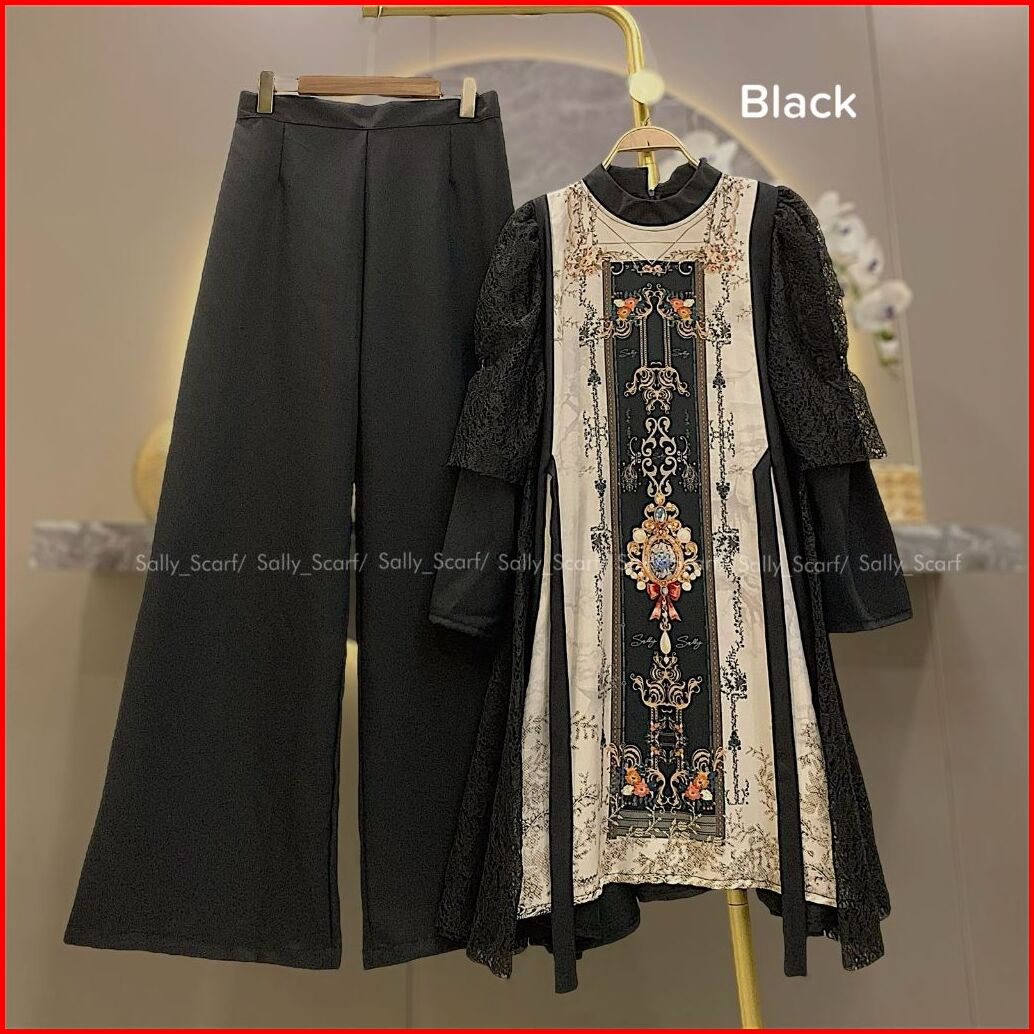 Sally Scarf- Zivara Tunik Setelan Celana Printing Mix Brukat Lace One Set Basic Daily