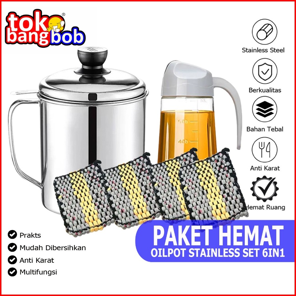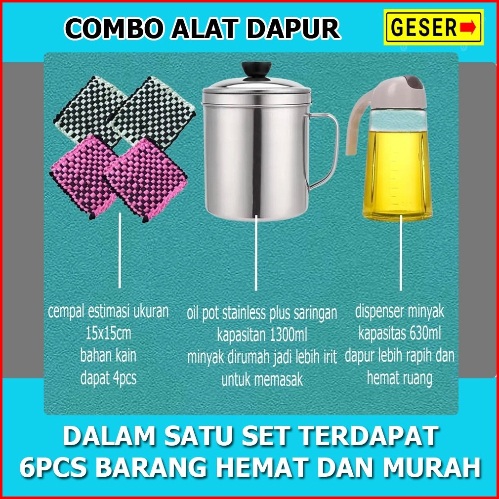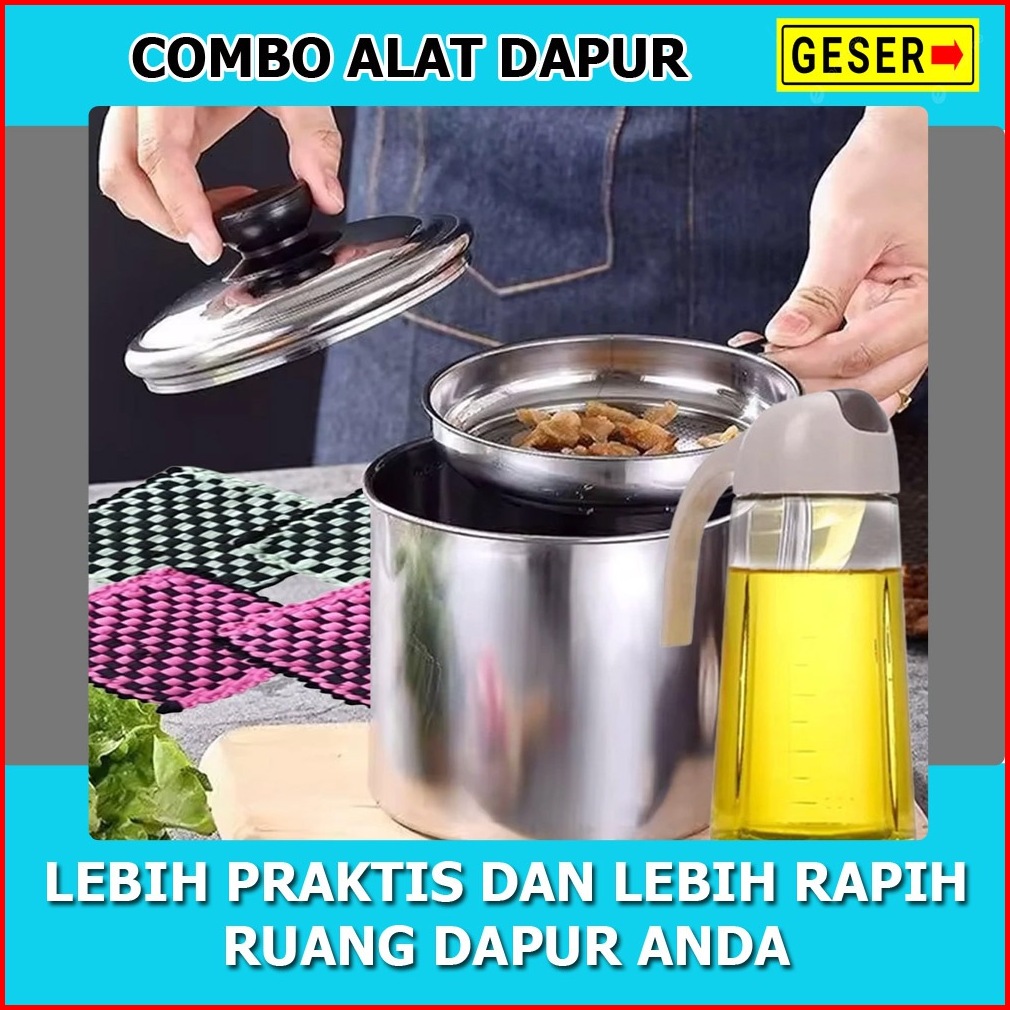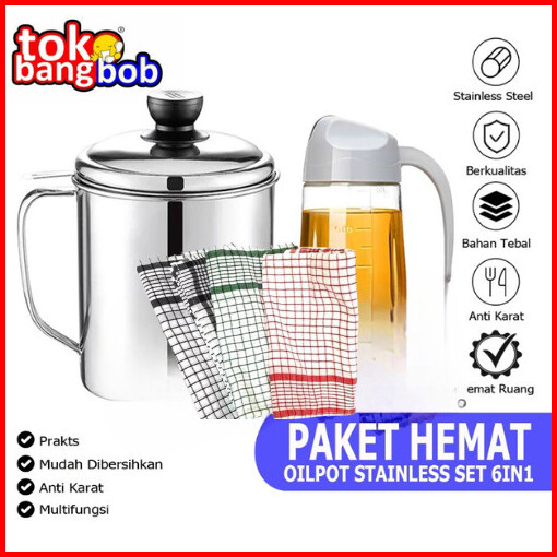 Combo Hemat 6in1 Oil Pot Stainless 1000ml Plus Dispenser Minyak 630ml Dan Lap Cempal 4pcs
