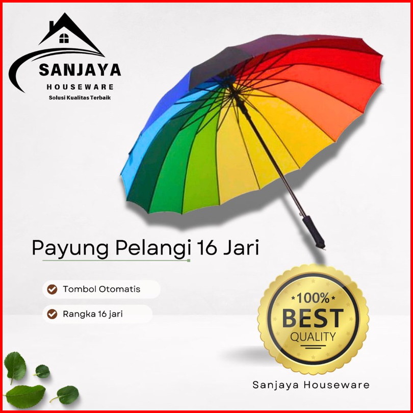 Sinar Payung Pelangi Ukuran Standar Diameter 110cm 16 Jari Tombol Otomatis Gagang Lurus