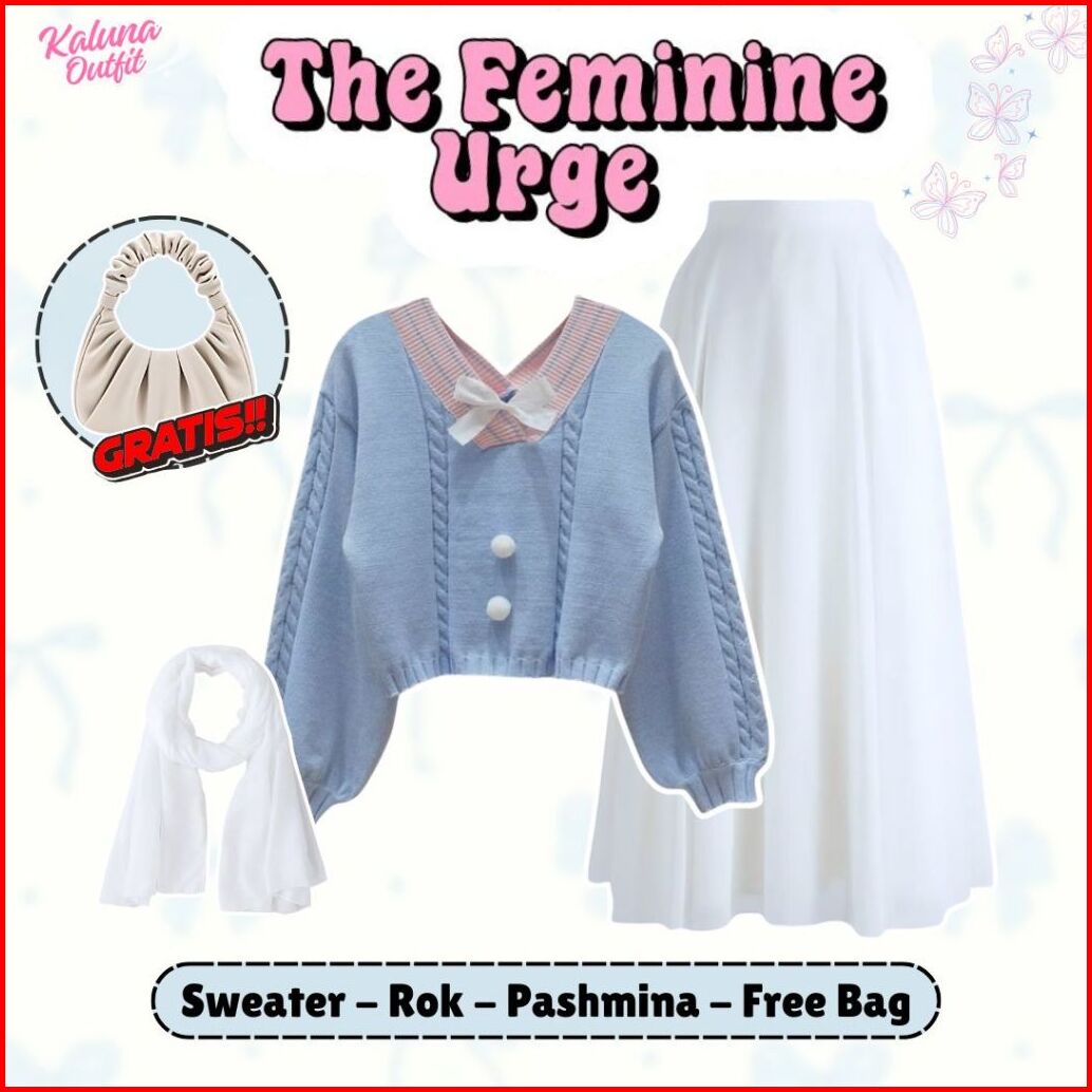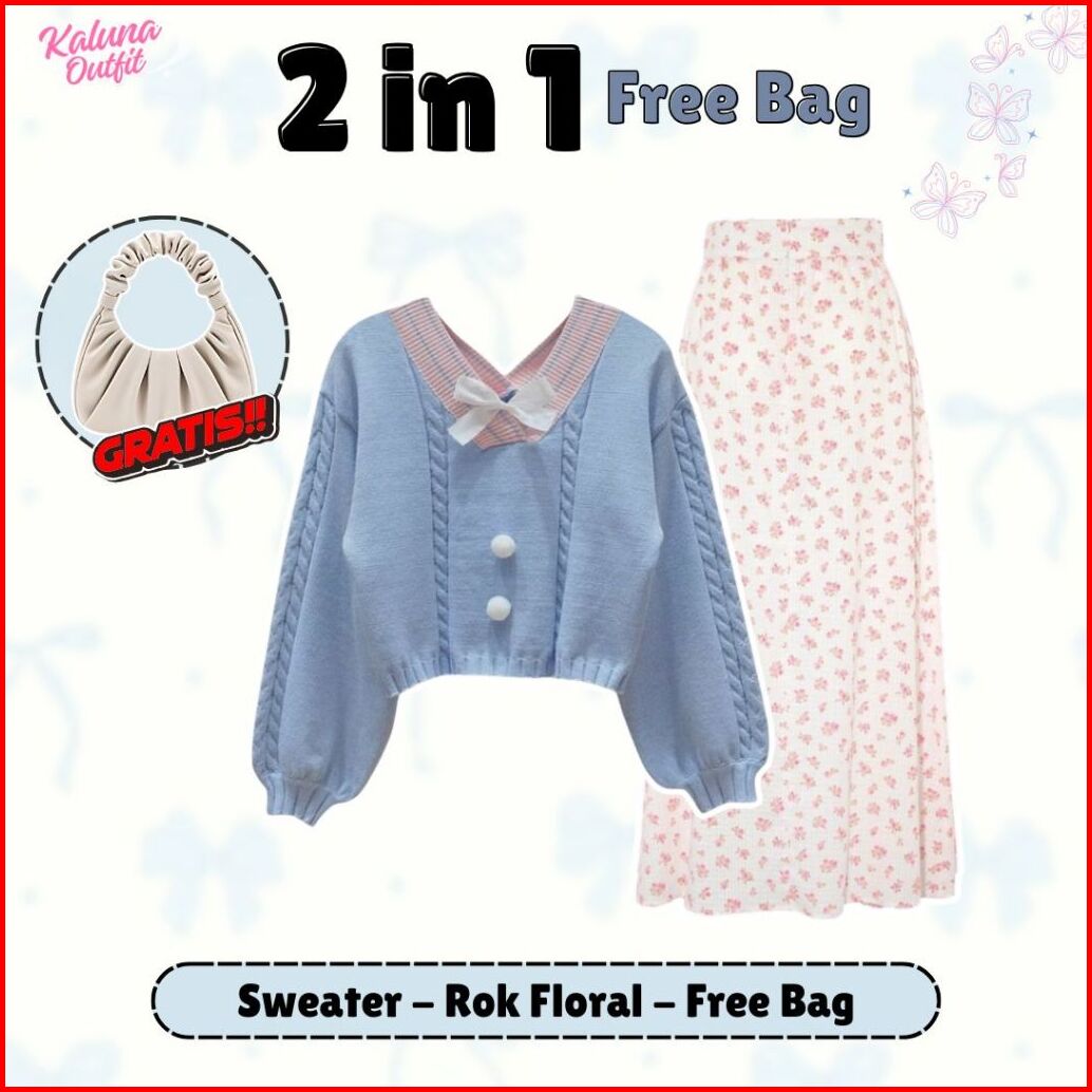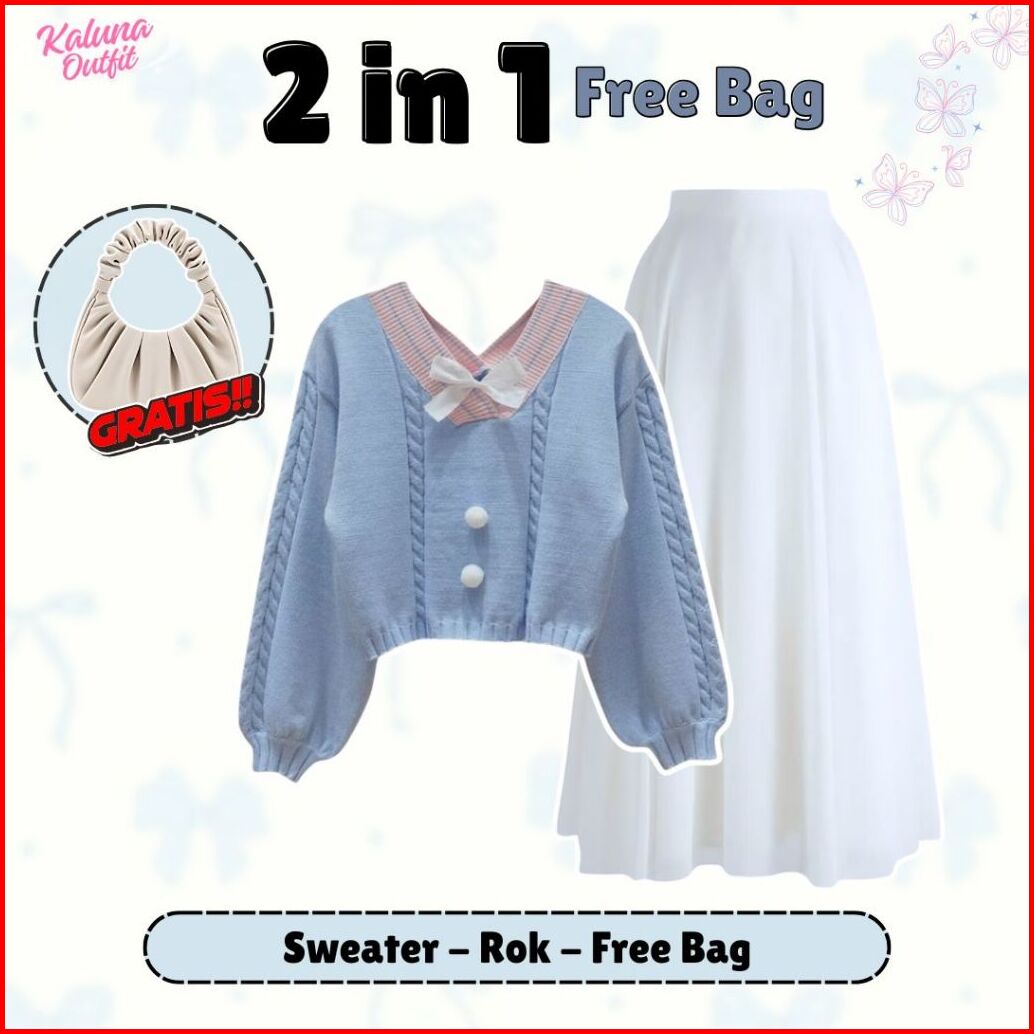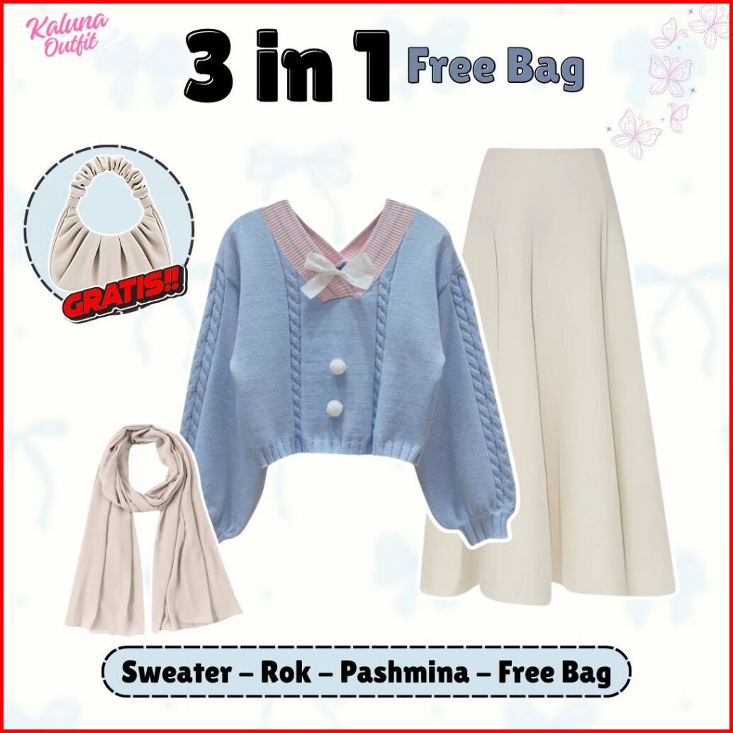 One Set 3in1 Korean Style Sweater Rajut Rok Joda Scuba Pashmina Ceruty Free Shoulder Bag Outfit Remaja Kekinian Ko4t